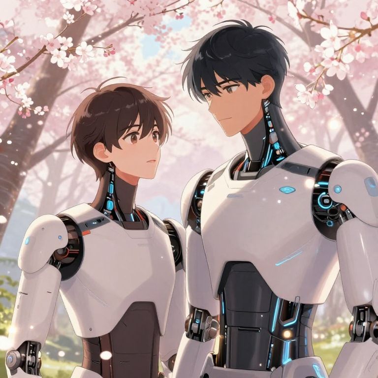 Digital anime-style drawing of two young male androids with black hair, white and black robotic bodies, standing under cherry blossoms.