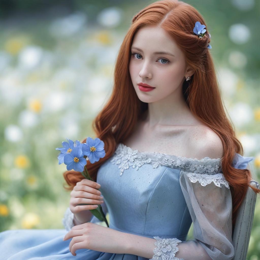 Red-haired Woman in Blue Dress Holding Blue Flowers