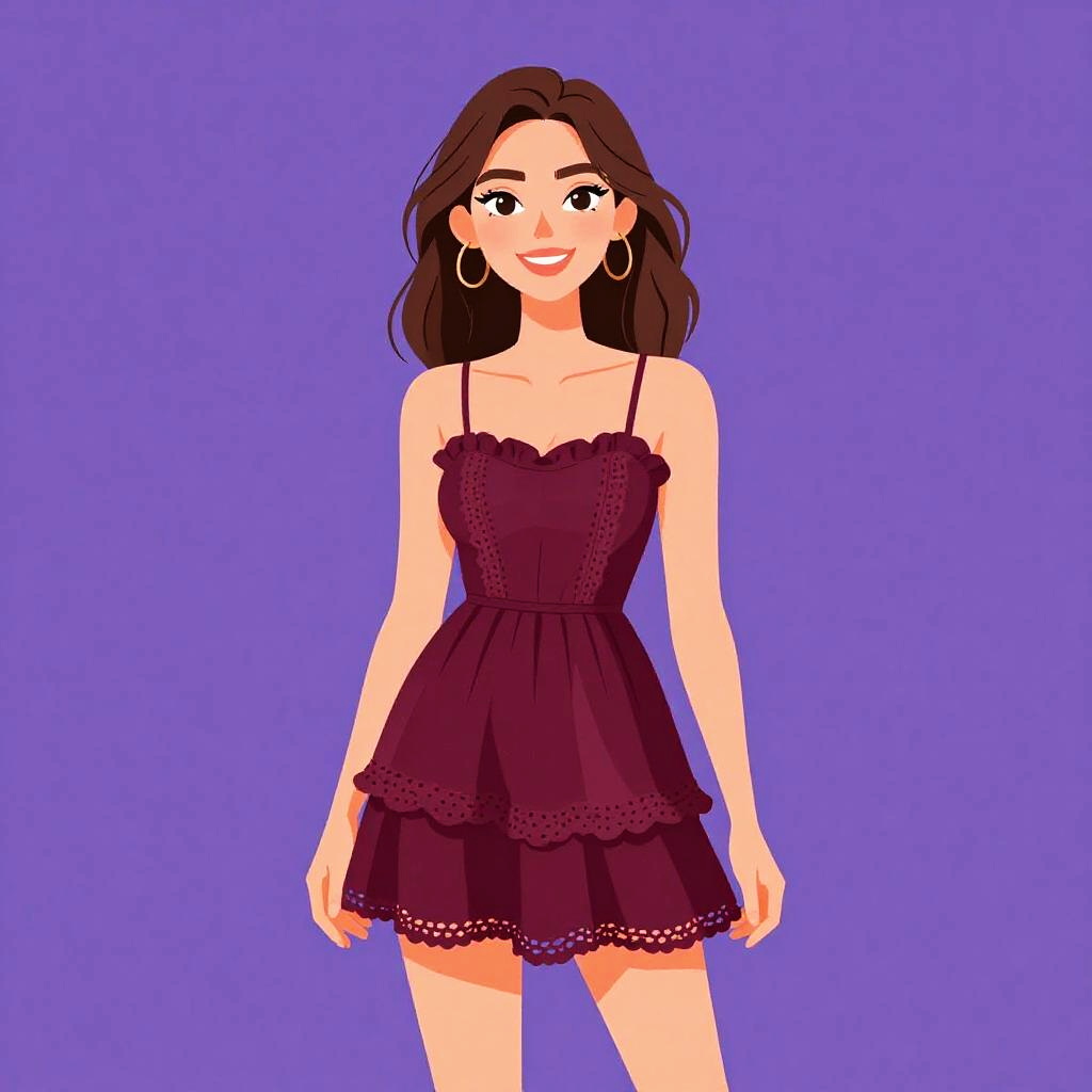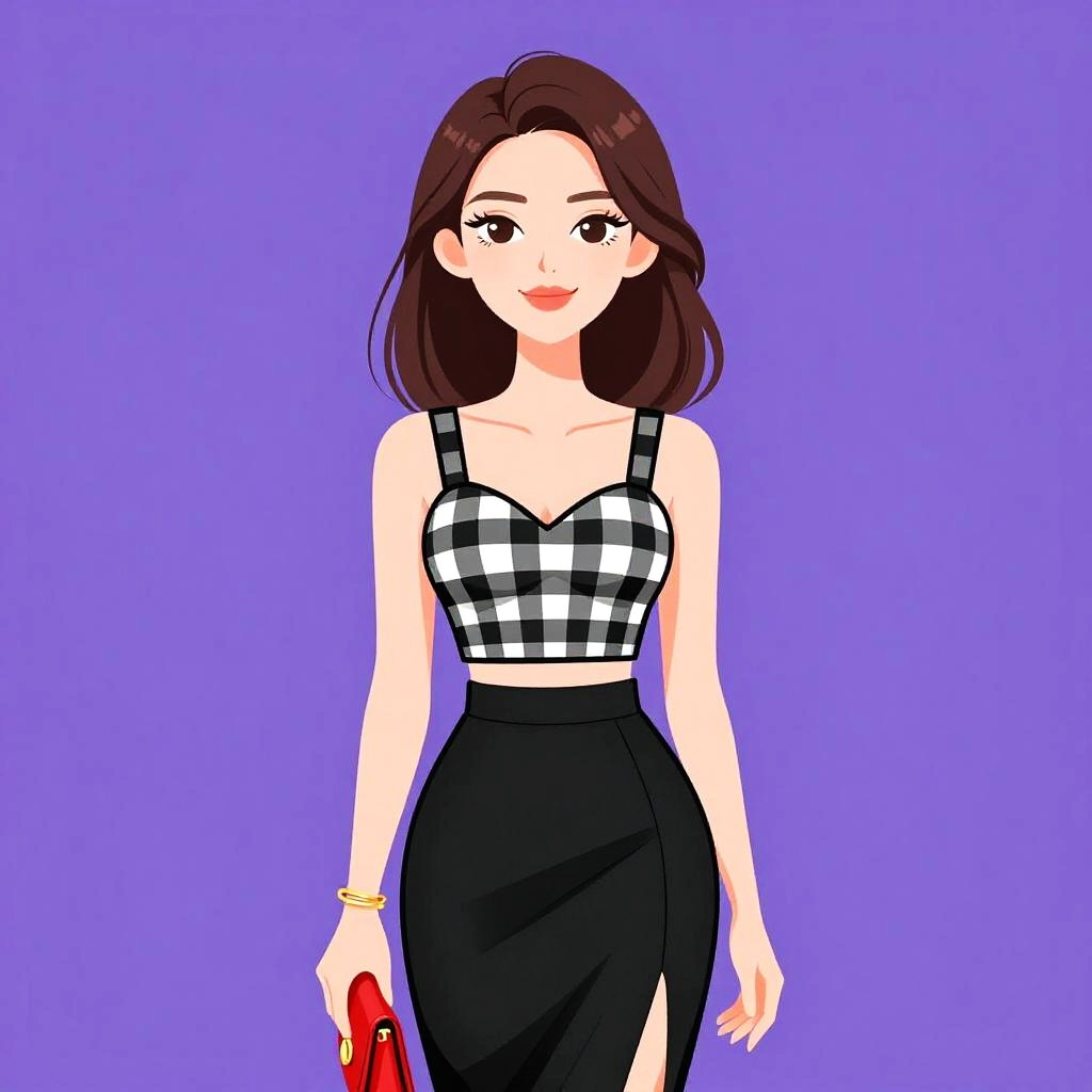 Woman with pretty face and pretty hair. Woman, business casual, taupe lace-up tank top with paisley print, sleeveless, scoop neckline, black skinny trousers, maroon knit cardigan with ribbed texture, open front, long sleeves, gold cuff bracelet. --sref 1461
