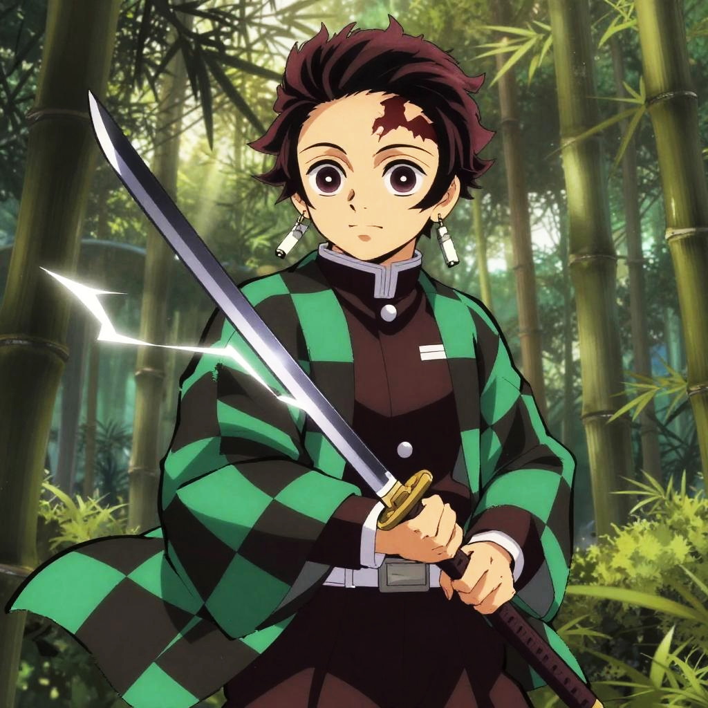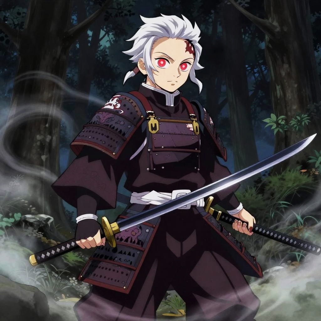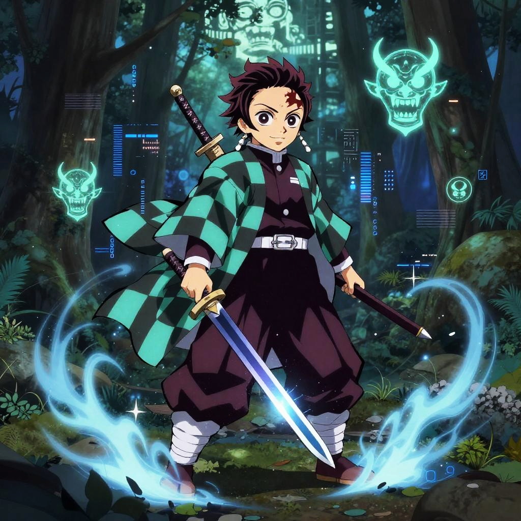 Demon Slayer character generator, design a heroic figure with intricate demon-slayer uniform, fierce eyes glowing red, holding a nichirin blade with ornate patterns, set against a dark, moonlit village backdrop, anime-inspired dynamic pose and vibrant colors.