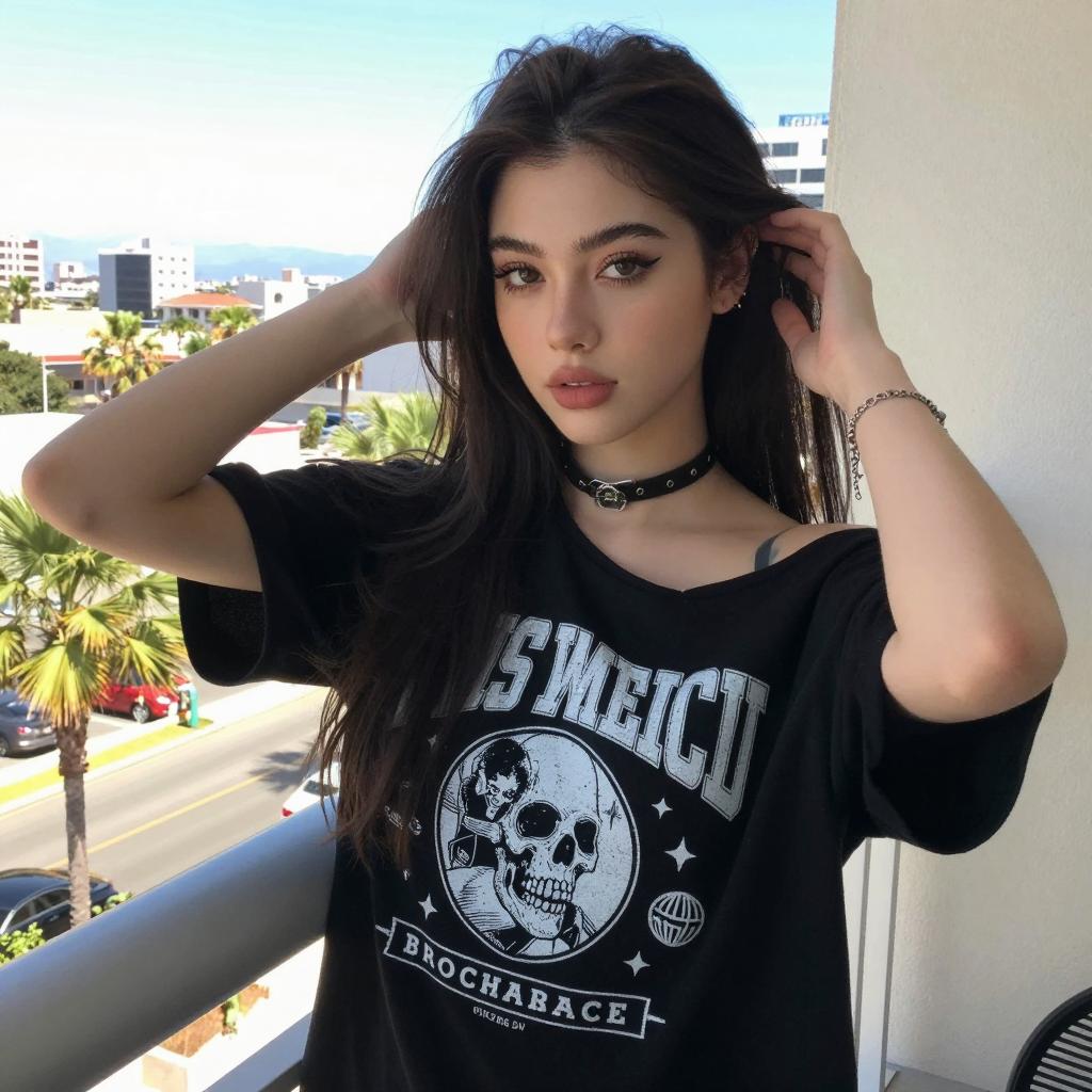 Young woman with long dark hair, brown eyes, and heavy makeup. She wears a black off-shoulder T-shirt with a graphic print, a choker necklace, and a bracelet. She stands on a balcony, hands in her hair. Tattoo on her right upper arm. Background includes a cityscape with palm trees and buildings. Bright daylight.