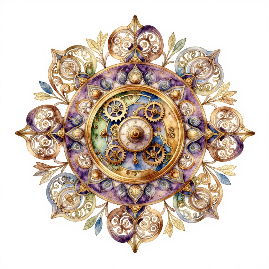 The image presents a stunning watercolor steampunk mandala set against a pure white background. The mandala features a central, intricate clockwork mechanism with gears and cogs, surrounded by a series of ornate, swirling patterns that radiate outward. The outer ring is adorned with delicate, leaf-like shapes and intricate, swirling designs, creating a sense of depth and complexity. The color palette is rich and varied, with shades of gold, purple, blue, green, and brown blending seamlessly together. The watercolor effect adds a soft, dreamy quality to the image, while the steampunk elements bring a sense of mechanical elegance and historical charm. The overall composition is balanced and harmonious, with the central clockwork mechanism serving as the focal point, drawing the viewer's eye inward and then outward through the swirling patterns and leaf-like shapes.