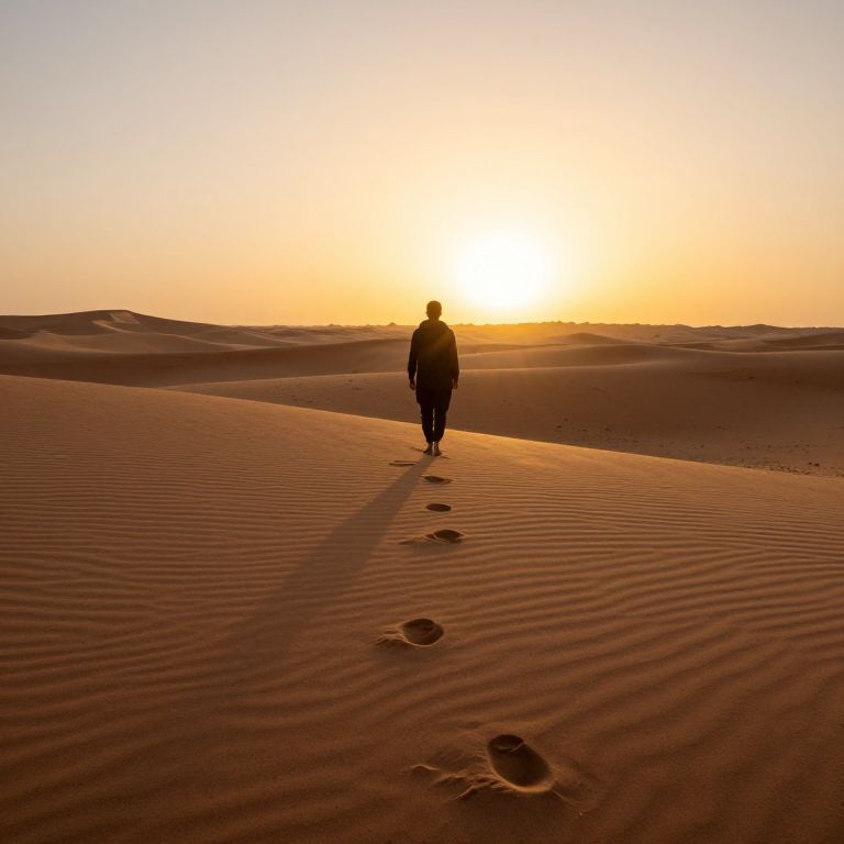 In the golden embrace of a desert sunset, a solitary figure walks toward the horizon, leaving behind a trail of footprints that echo the weight of introspection and the quiet promise of renewal, as the warm, textured sand whispers tales of solitude and the timeless dance between presence and absence.