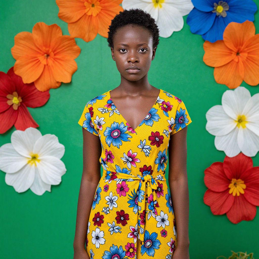 Photograph of a young Black woman with short, curly hair, wearing a vibrant yellow dress adorned with a colorful floral pattern featuring red, blue, and white flowers. She stands against a bright green background decorated with large, papier-mâché flowers in orange, white, blue, and red. Her expression is neutral, and she is centered in the frame. The dress has short sleeves and a V-neck, and the texture of the dress appears to be lightweight and flowy. The papier-mâché flowers are attached to the wall, creating a playful and colorful backdrop. The photograph is brightly lit, emphasizing the vivid colors.