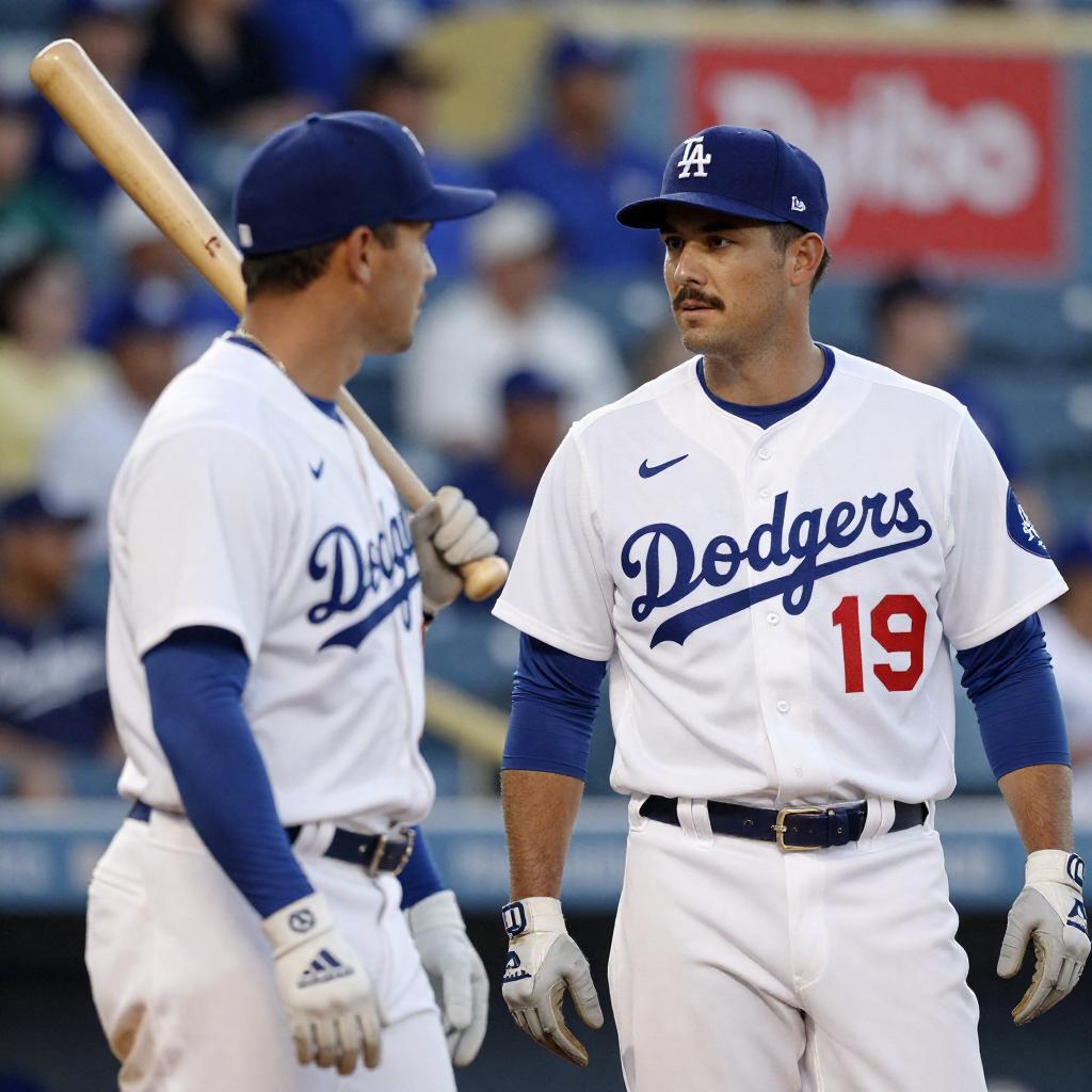 Photograph of two male baseball players in blue and white jerseys with "Dodgers" , blue caps, and gloves. One player holds a wooden bat over his shoulder, the other stands facing him. Stadium crowd in background, Ryobi sign on wall. Both players have focused expressions, player with bat on right has mustache.