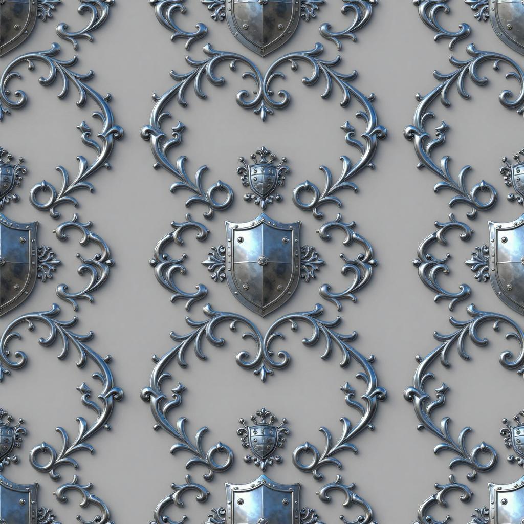 Scrollworks pattern featuring Heraldic scrollwork framing shields and crests in steel blue scrollwork on foggy grey arranged as seamless repeating wallpaper pattern with interlocking flourishes on ornate invitation or certificate background rendered as 3D rendered metallic scrollwork with realistic reflections, ultra-detailed, sharp ornamental design, high resolution, intricate decorative pattern art
