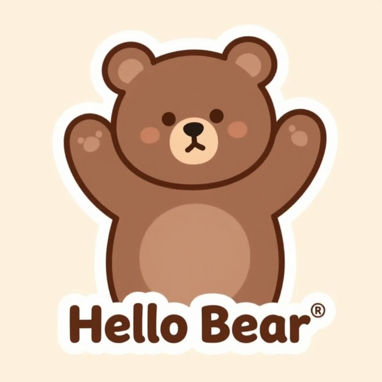 Cute brown bear sticker waving cheerfully with both arms raised, featuring the text \"Hello Bear®\" prominently displayed below its body against a soft beige background.