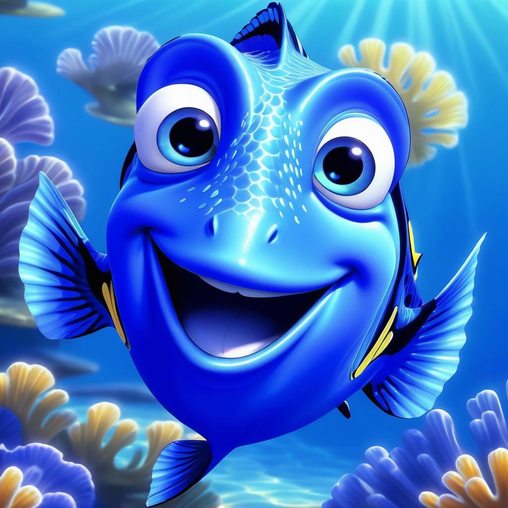 An oil-painted digital portrait of a cute, curious blue fish resembling Dory from Finding Nemo, featuring bright blue scales, a friendly smile, large expressive eyes, and intricate details of underwater bubbles and fins.