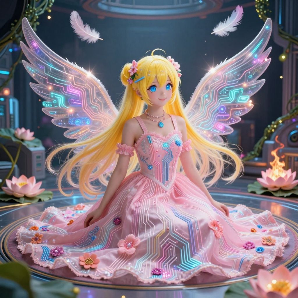 New work, new, text, electronic circuit pattern dress, electronic circuit pattern, miku, masterpiece, best quality, 8K, (photorealistic:1.4), (Vivid colors:1.3), (content expression:1.3), Electronic girl. Cyberpunk magic. Electronic wings dress. Electronic room. A world with an original and fantastical atmosphere. A world with an original and fantastical atmosphere, smile, yellow Electronic hair, blue Electronic eye, pink long dress, cute, soft, cool, kawaii, flower, thin, wind, sit, skart, soaring feathers, Lens flare, glitter, lotus, vine, electronic room, fly, fire, water, rug, ring, float, wing dress, warp, rise, Transform, flow, science, embroidery, eyelashes, loose, sfw