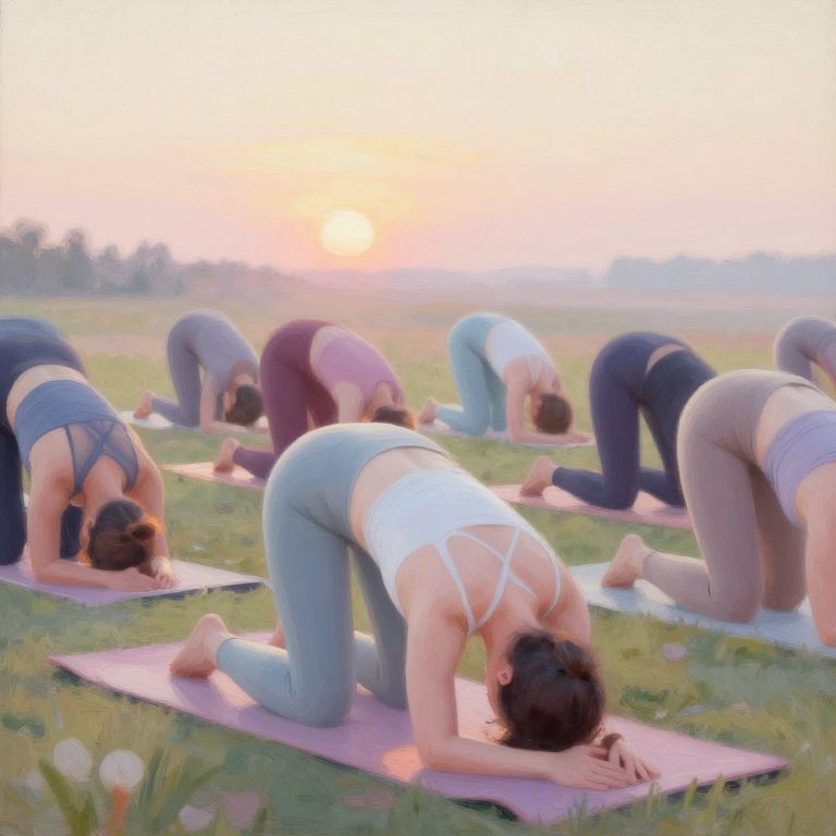 Joints in yoga poses, serene scene of diverse people practicing yoga outdoors at sunrise, focusing on their bent knees and elbows joints, soft pastel colors, peaceful and calming atmosphere, natural lighting, impressionist painting style.