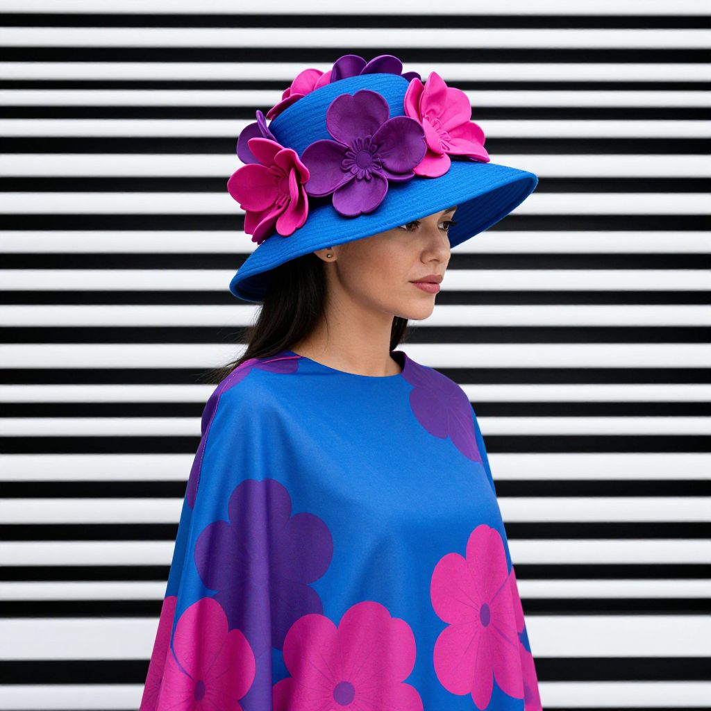 Photograph of a woman with medium skin tone and dark brown hair, wearing a vibrant blue and purple floral-patterned cape. She dons a striking blue hat adorned with large pink and purple flowers. The background features bold black and white horizontal stripes, creating a stark contrast. The woman's face is partially visible, turned slightly to the side, showing a neutral expression. The image has a bright, colorful, and modern aesthetic, emphasizing the bold floral patterns and the dramatic hat.