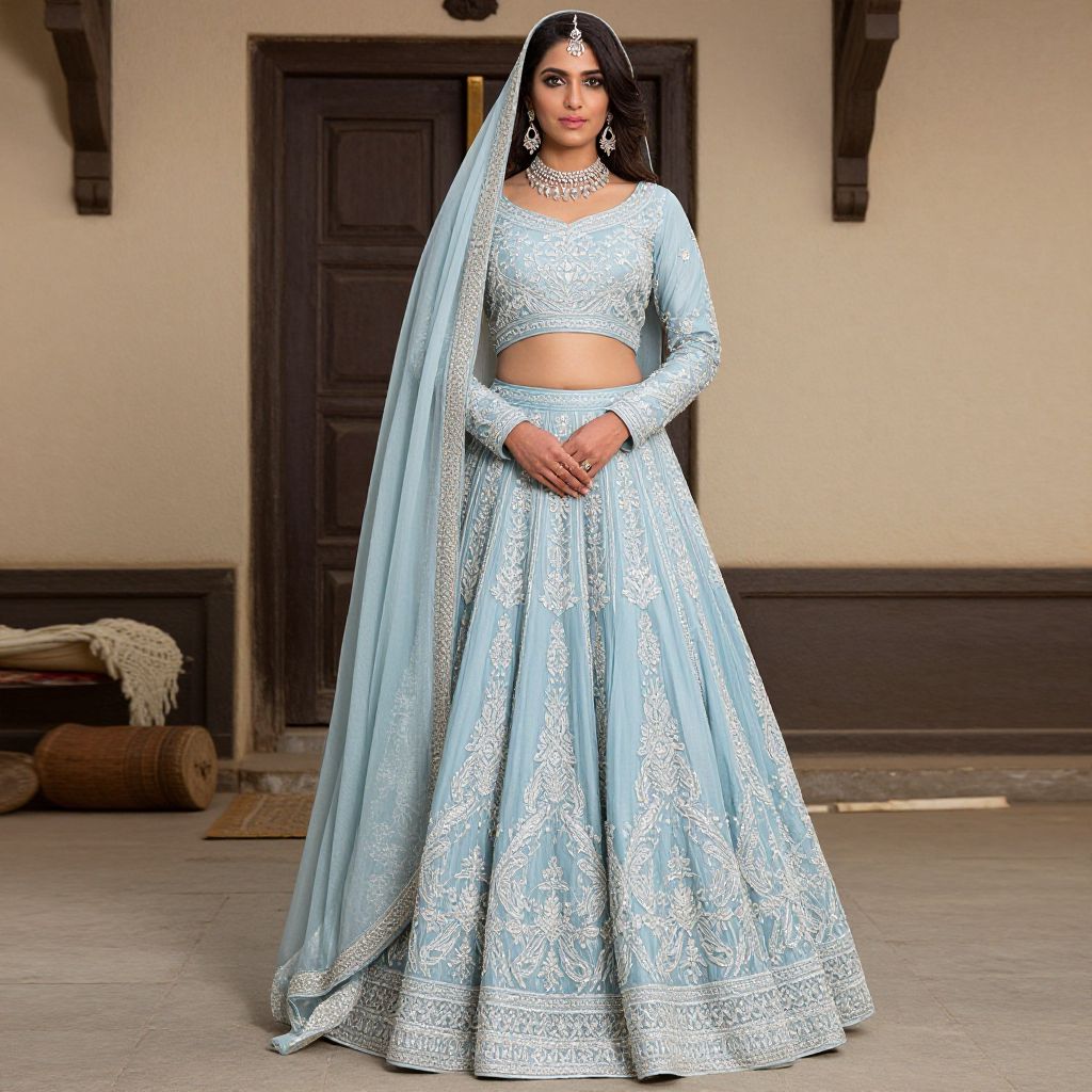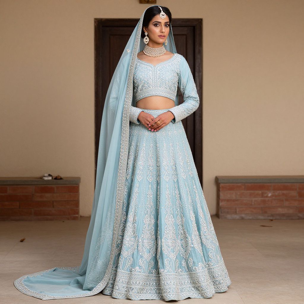 Photograph of a South Asian woman in a light blue, intricately embroidered traditional lehenga and dupatta, standing indoors against a beige wall with a