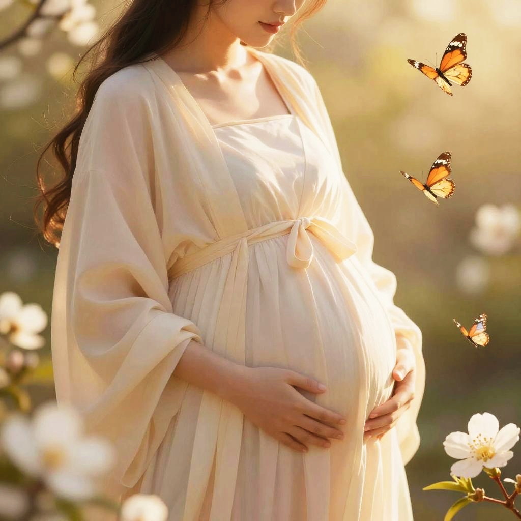 The biggest pregnant belly, illustrated with a gentle, serene mother in flowing robes, holding her belly which is glowing softly, surrounded by blooming flowers and butterflies, soft focus, warm golden hour lighting, realistic digital art.
