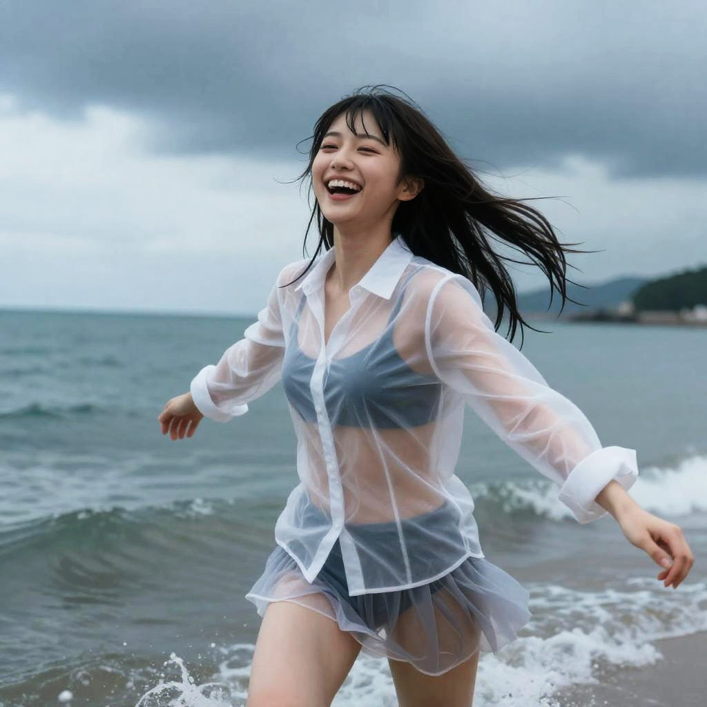 (masterpiece, best quality), (absurdres:1.3), (photorealistic:1.5), RAW photo of (20-year-old:1.4) kawaii Japanese idol, (dynamic pose:1.2), long hair, (young:1.3), slim, detailed eyes, detailed face, (cinematic composition:1.2), wet transparent shirt, see-through, pleats skirt, beach, ocean, sky, dramatic lighting, in sea, water, happy laughing