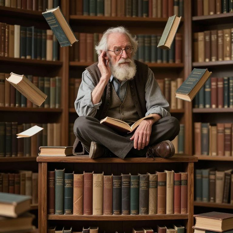 An ageless librarian sits cross-legged atop a floating bookshelf, whispering forgotten histories into the ears of levitating tomes.