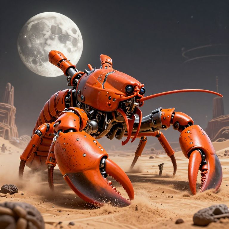 Digital art of a robotic, orange lobster with large claws, under a full moon in a dusty, desert-like landscape.