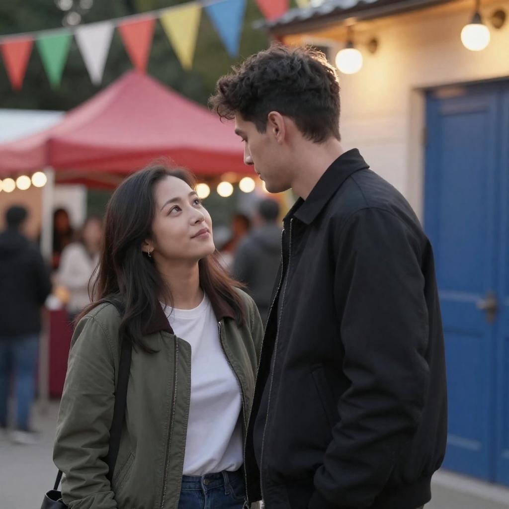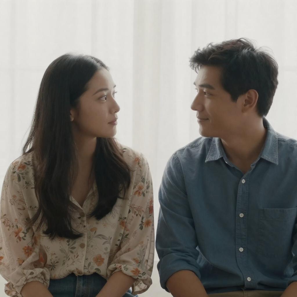 Photograph of a man and woman in a dimly lit kitchen. The man, with short dark hair and a black t-shirt, stands facing the woman. She has long dark hair, wears a dark top, and holds a mug with both hands. A bright fluorescent light illuminates the background, revealing shelves and a window. The woman looks up at the man with a gentle smile.