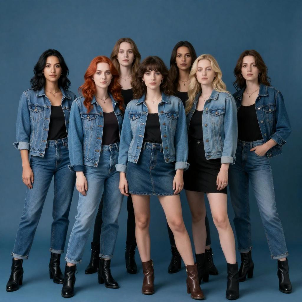 Photograph of seven women in casual clothing, standing in a row against a gray background. They are smiling and laughing, with varied hairstyles and outfits. Central woman in blue jacket and denim shorts raises arm. Others wear plaid shirts, striped tops, skirts, and jeans. Visible expressions: surprised, joyful, playful. Textures: leather jacket, patterned skirt. Poses: leaning, hugging, standing. Hair colors: blonde, black, brown, red.