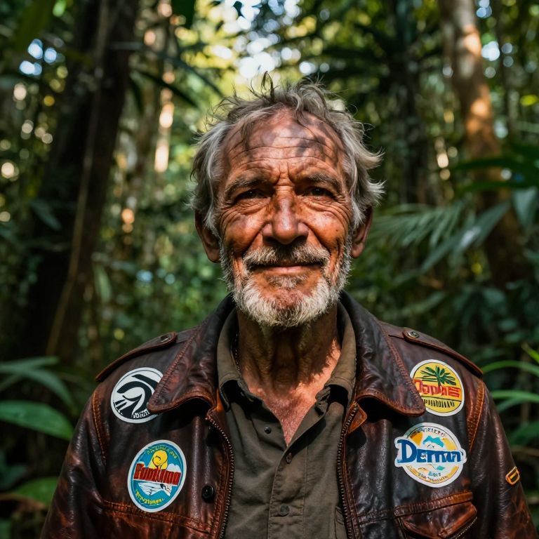 Craft an ultra-realistic portrait of a seasoned traveler, their weathered features framed by an enigmatic smile and vintage leather jacket adorned with exotic travel stickers from far-flung lands. Soft golden sunlight filters through the dense jungle canopy above, casting dappled shadows across their face. This intimate moment is captured from an insect's eye view, offering an immersive glimpse into the allure of distant horizons and the wisdom gleaned from life's journey.