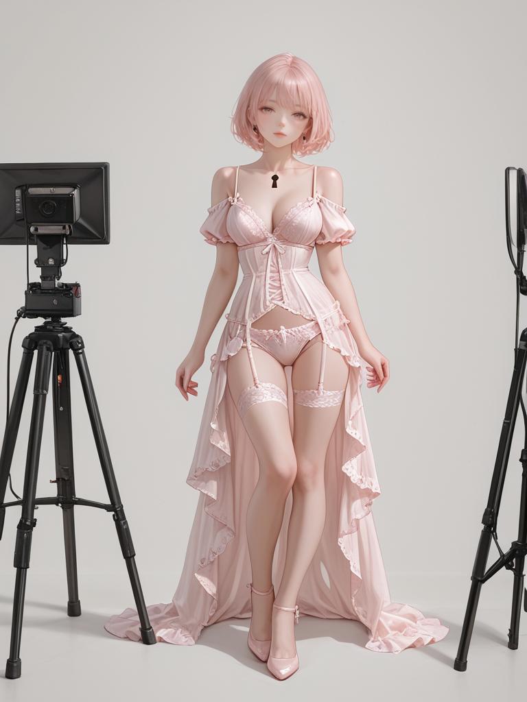 Full body shot of a woman with short pink hair wearing delicate light pink lace lingerie, including a bralette with spaghetti straps and a keyhole cut-out, matching high-waisted lace underwear, and a flowing pink lace train. She stands between two professional studio lights on a white background, wearing pink high heels.