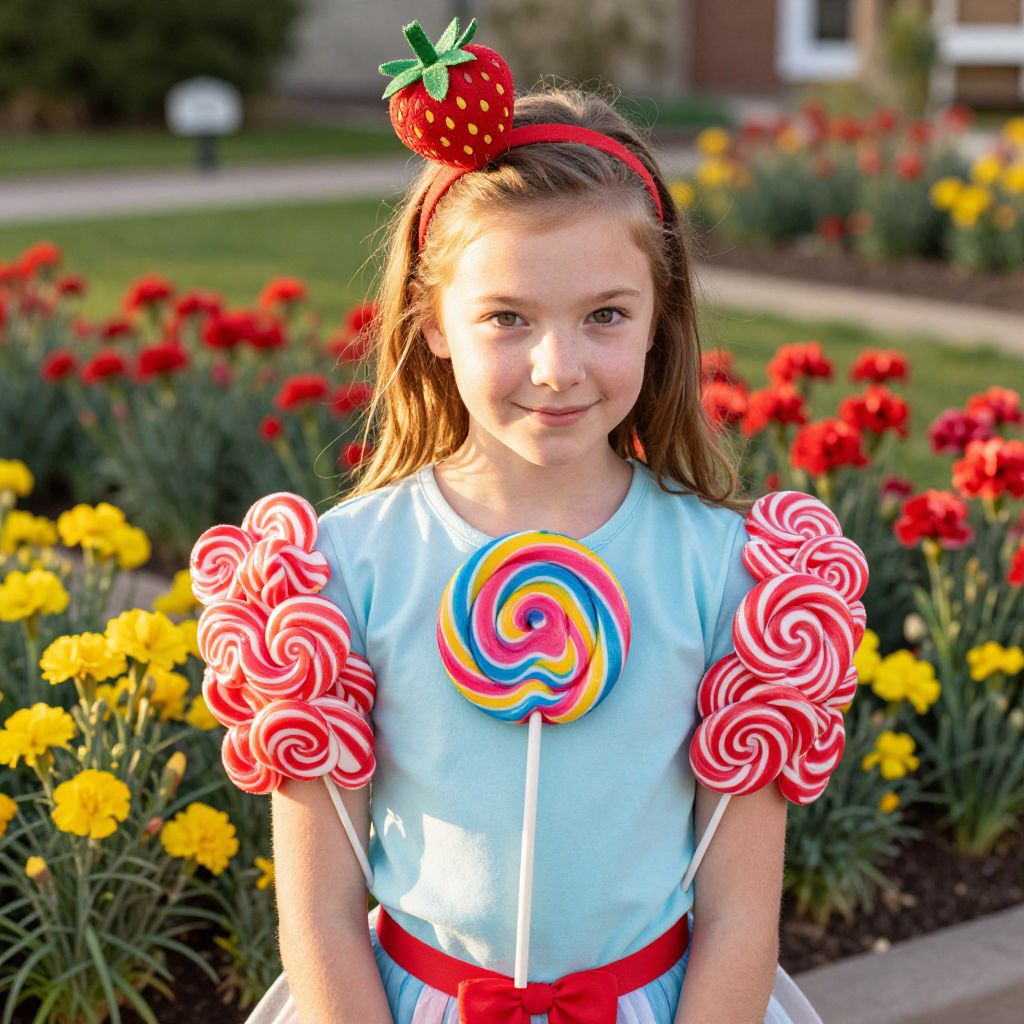 Photograph of a young girl with light brown hair, wearing a red headband with a strawberry decoration, standing in a vibrant garden. She has a light blue dress adorned with red and white swirled candy decorations on her sleeves and a large, colorful rainbow swirl lollipop on her chest. A red belt cinches her waist. The background features blooming yellow and red flowers, green grass, and a blurred red brick building. She smiles softly at the camera, bathed in bright sunlight, creating a cheerful and whimsical scene.