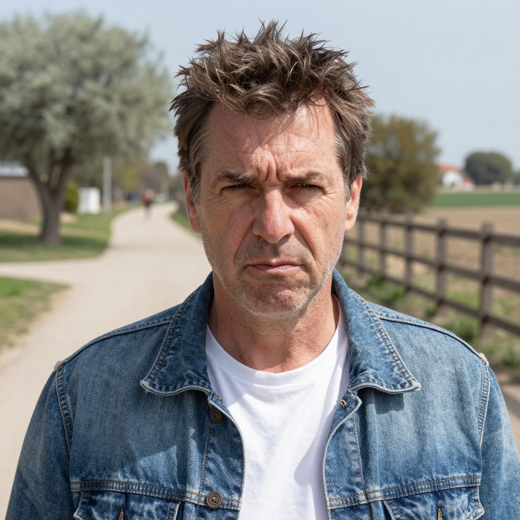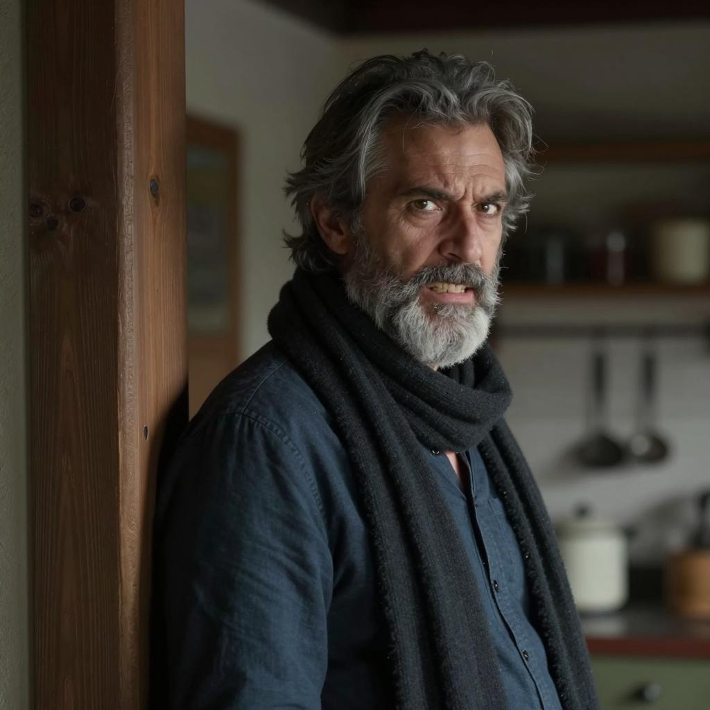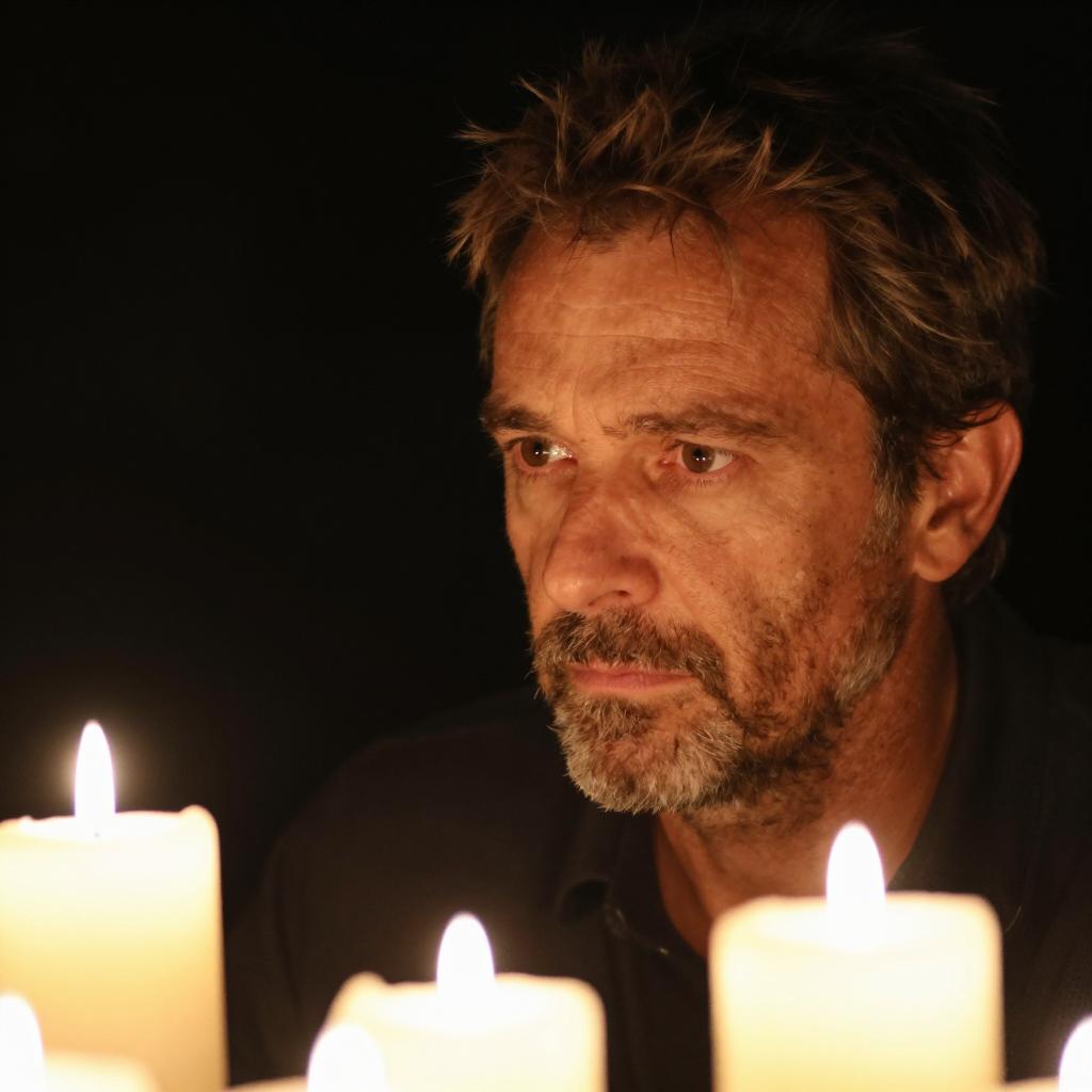 A middle-aged man with short, disheveled brown hair, rugged face, and slight beard, illuminated by several large, glowing candles. He has a serious expression, looking to the left. The dark background emphasizes the candlelight. The man is positioned on the right side, candles on the left.