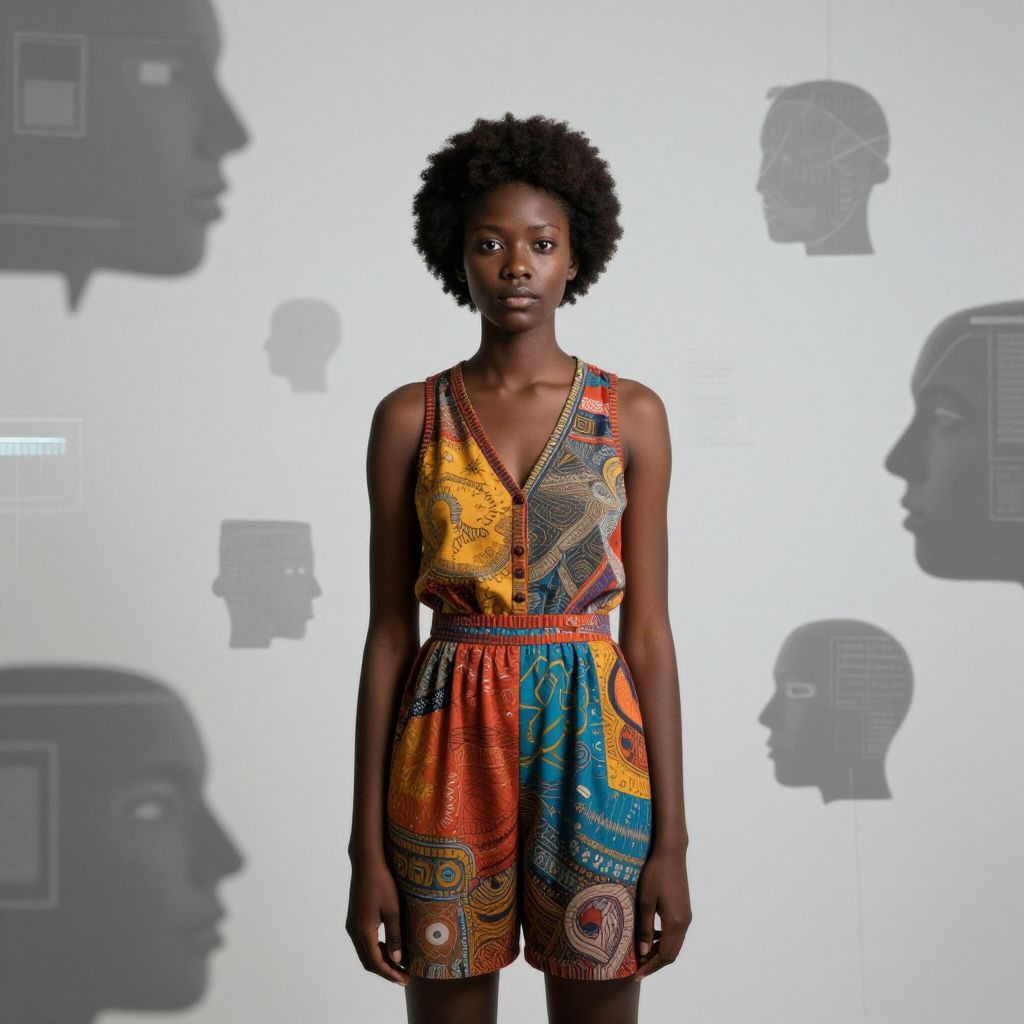 Photograph of a young Black woman with dark skin and short, natural afro hair, standing against a gray background. She wears a colorful, patterned, sleeveless dress with vibrant red, yellow, blue, and orange geometric and tribal designs. Her expression is serious and focused. On either side of her are two illuminated, white wireframe head outlines, creating a symmetrical, futuristic effect. The wireframe heads are detailed with lines and nodes, contrasting with the soft, natural texture of her dress and skin. The overall composition combines modern, digital elements with organic, human qualities.