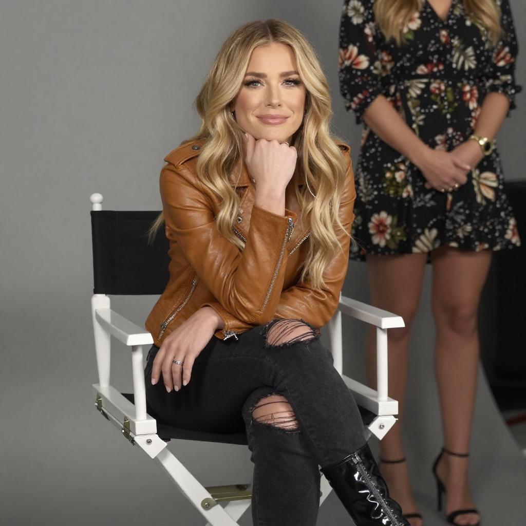 Photograph of a blonde woman with wavy hair, fair skin, and blue eyes, wearing a green puffer jacket, sitting in a black mesh office chair. She is smiling and making a peace sign with her right hand. Red curtains are in the background, and a desk with colorful objects is in the foreground.