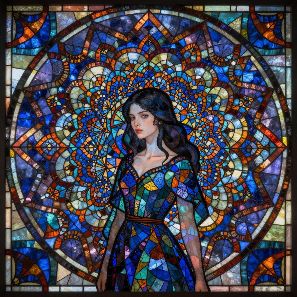 Masterpiece, best quality, 1girl, fractal art, stained glass art style