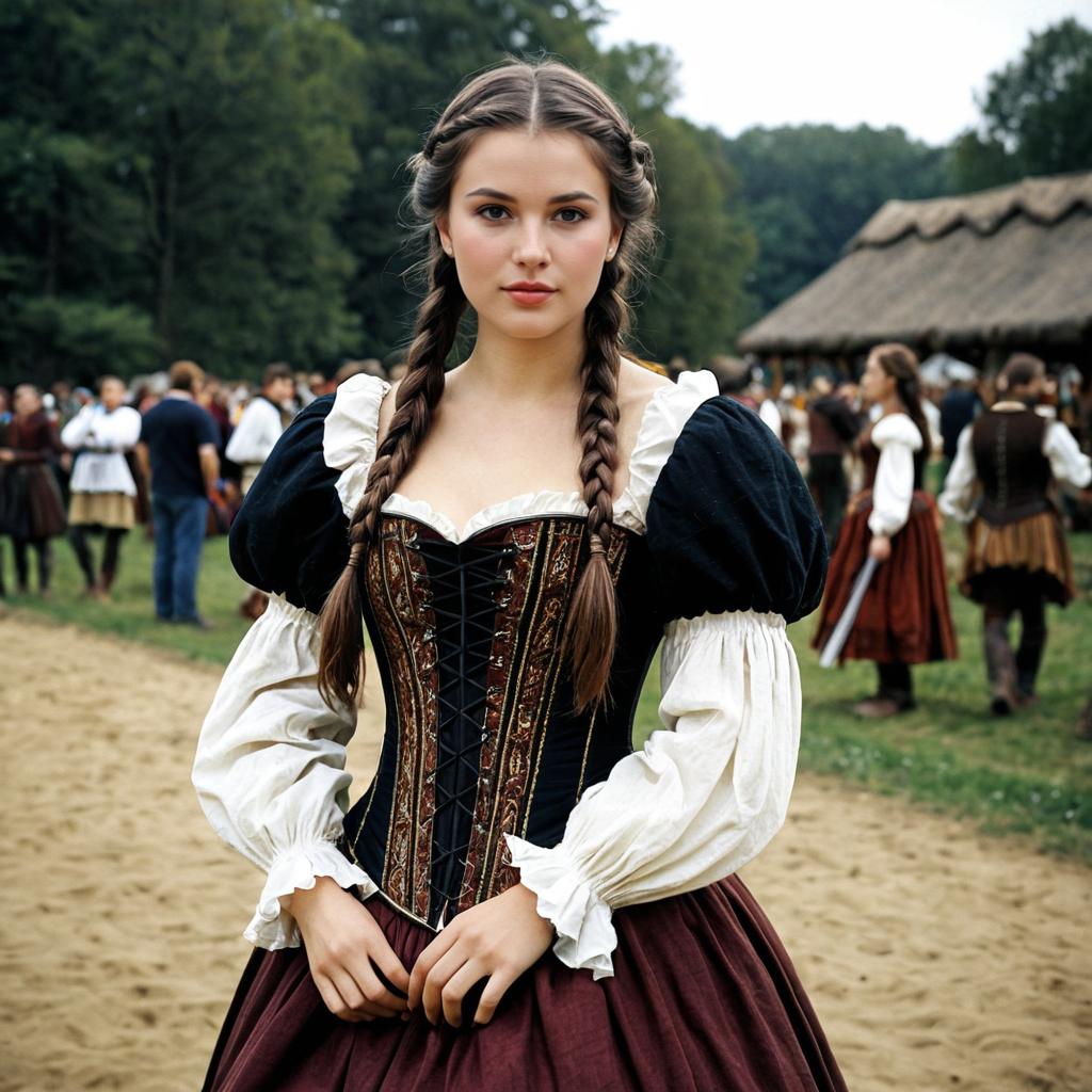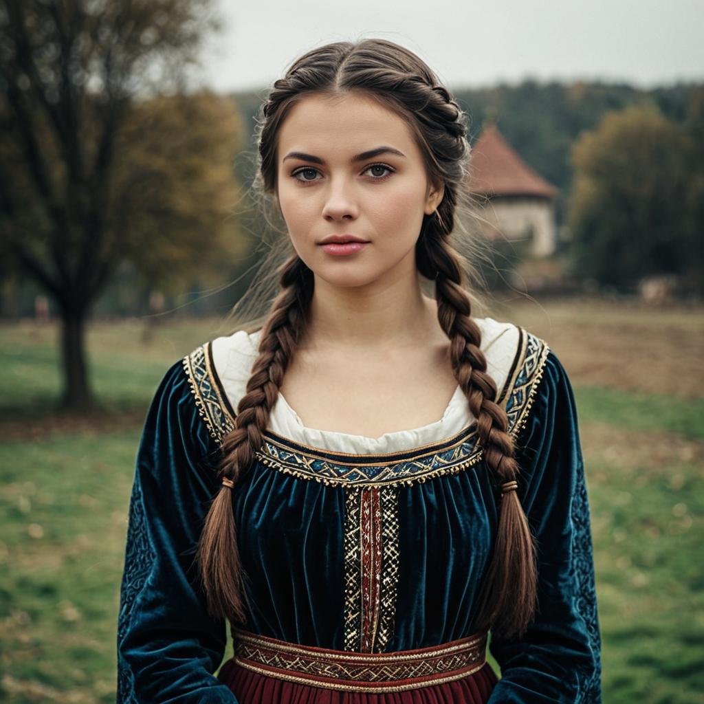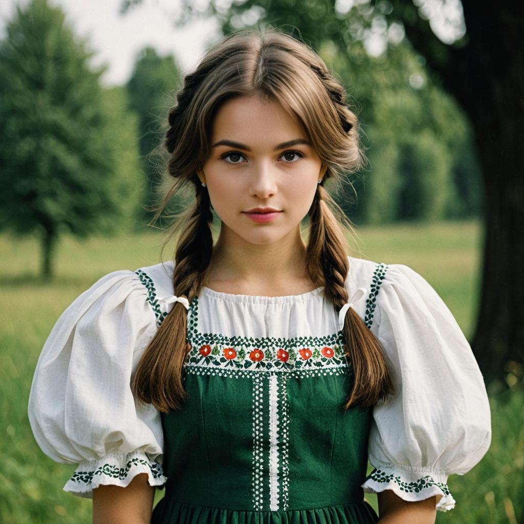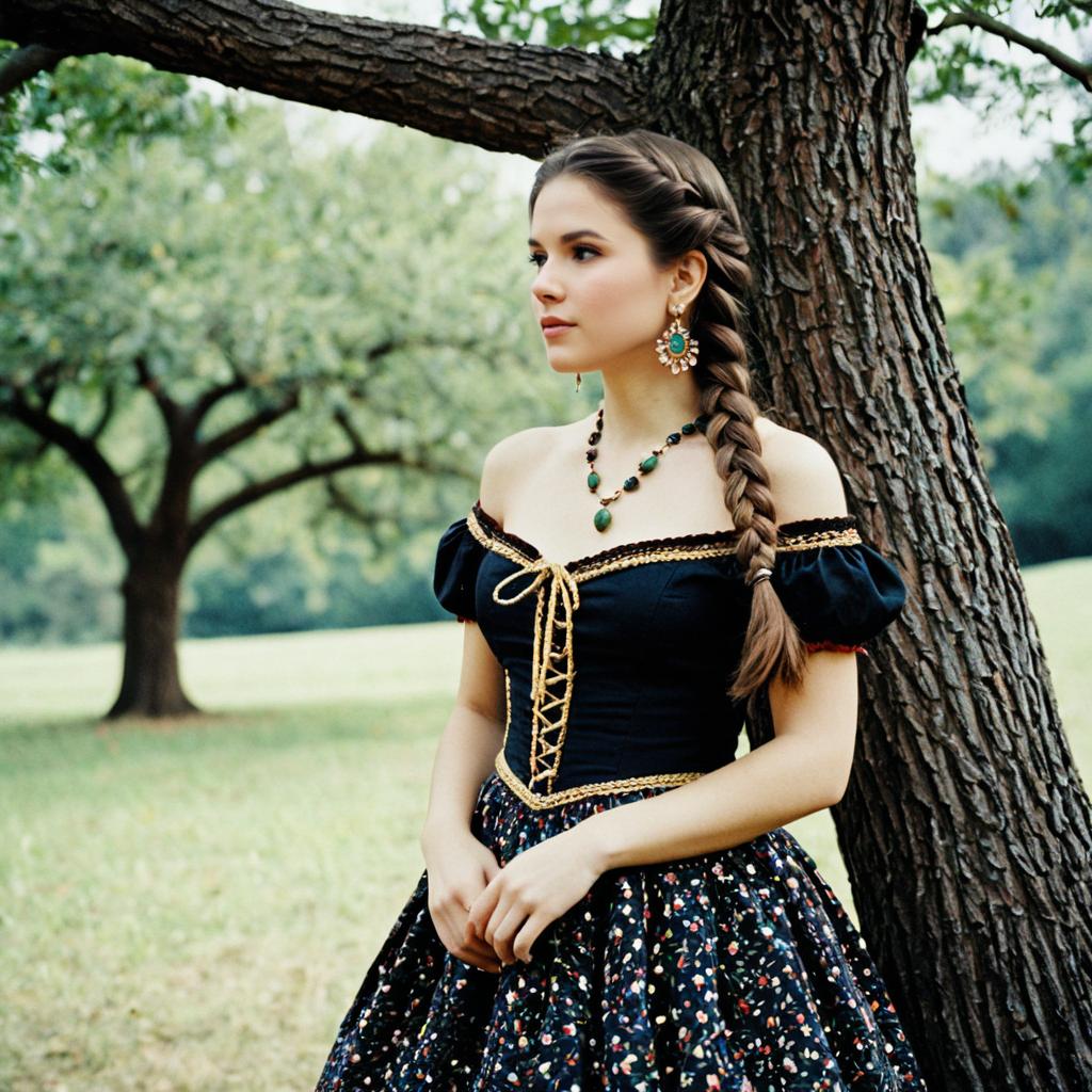 Tarantella costume,1girl, solo, dress, tree, long hair, bare shoulders, outdoors, brown hair, realistic, earrings, skirt hold, off shoulder, jewelry, braid, off-shoulder dress