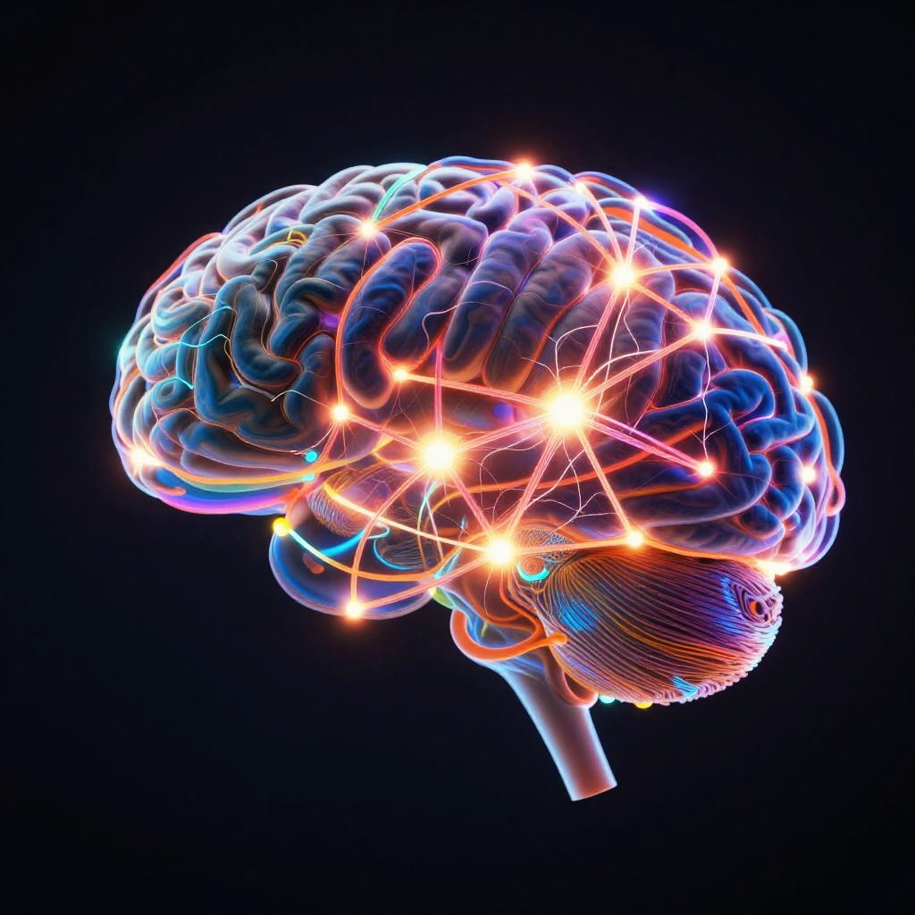 Abstract representation of sinapsis as a luminous web of synaptic connections in a human brain, colorful electric pulses lighting the network, surreal and vibrant style, blending scientific art with fantasy elements, high resolution