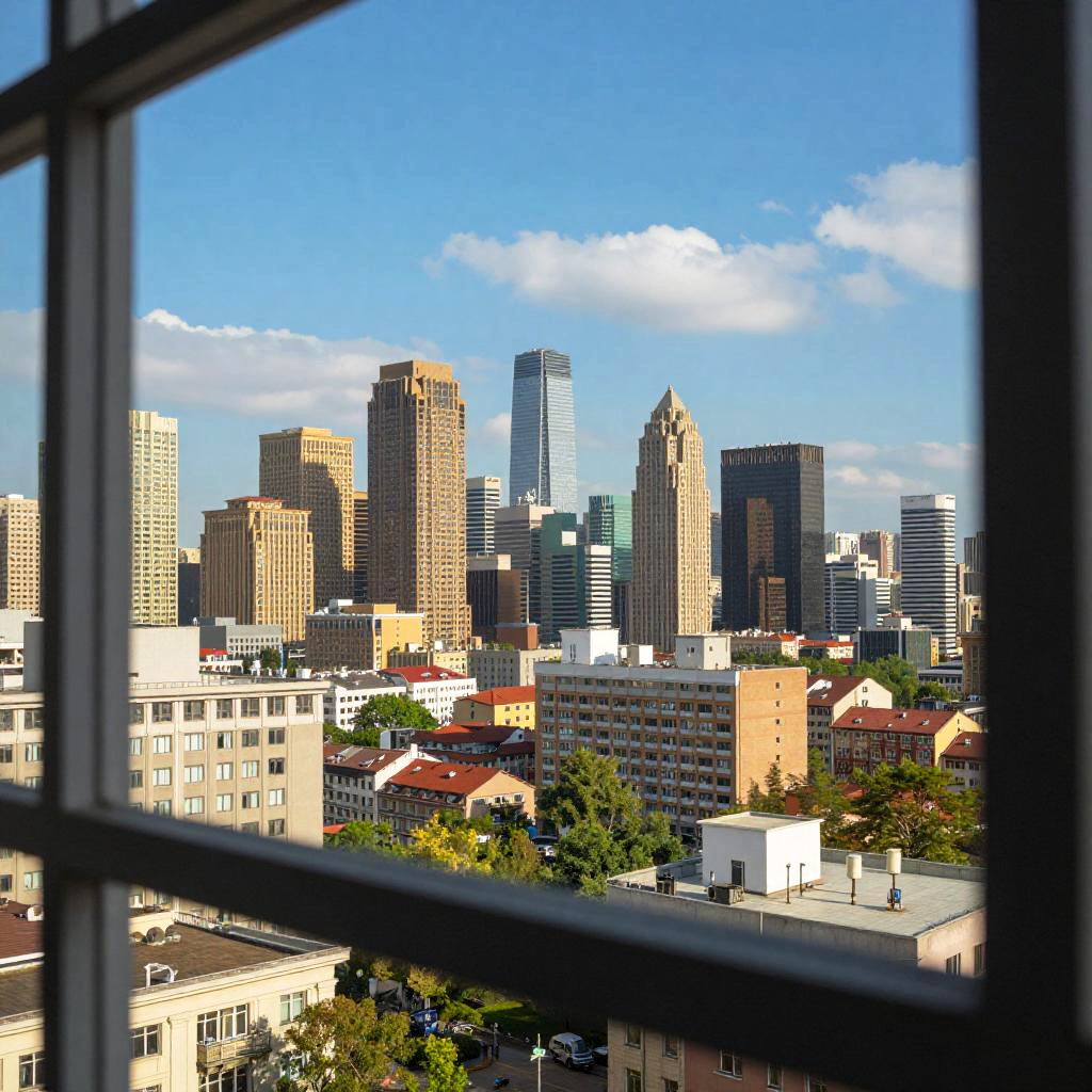 Remove reflection from photo, a scenic cityscape captured through a window, smooth out all reflections and distortions, vibrant natural lighting with detailed urban textures, hyperrealistic image, vivid sky and sharp architectural details.