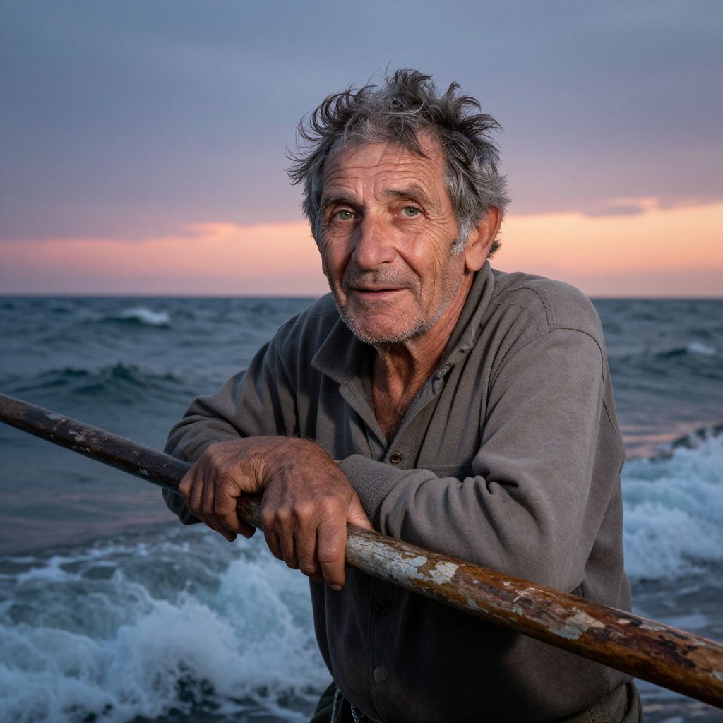 Envision a photorealistic portrait of an aged fisherman, his weathered skin and gentle green eyes reflecting years spent under the sun's kiss. Set against a tumultuous sea backdrop, he leans on a time-worn oar, his posture conveying both fragility and strength. The horizon, where sky meets water in a ballet of colors, draws his gaze. Soft, diffused light highlights the creases on his face, evidence of navigating life's vast ocean. A playful breeze dishevels his thick hair, adding to the sense of connection with the untamed sea. This evocative portrait captures the beauty of nature and the indomitable human spirit enduring life's storms.