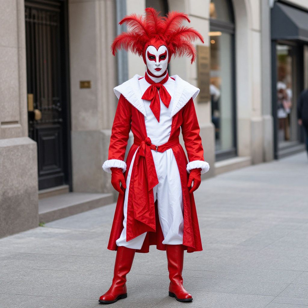 Red Carnival Costume, dressed in red and white standing on a sidewalk
