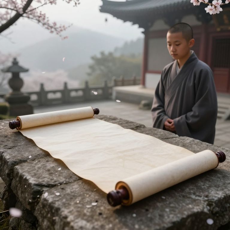 A detailed wide-angle shot of a vintage paper scroll wrapped in fabric, resting on a rustic stone surface in a mountain temple courtyard. The setting is misty morning, with cherry blossoms drifting in the air, and a young monk with soft features and a calm demeanor stands nearby, his eyes focused on the scroll.