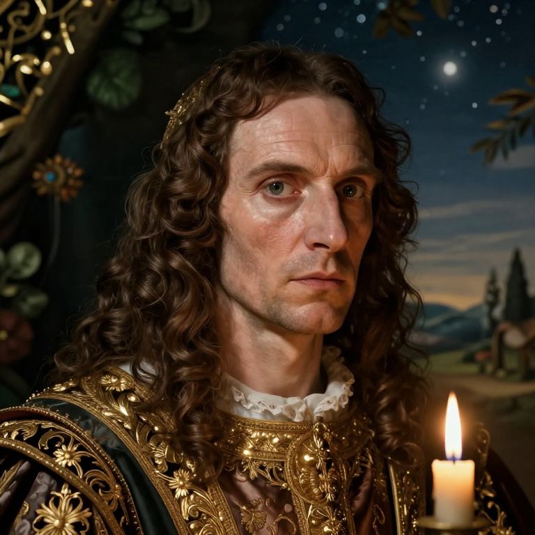 This is a digitally manipulated photograph of a serious-looking man with long, curly brown hair, fair skin, and blue eyes. He wears an ornate, gold-embroidered, medieval-style garment with a white lace collar. The background is a nighttime scene with a starry sky, a wax candle in the lower right, and a faintly lit, rustic landscape with trees and a distant mountain. The man's face is slightly illuminated by the candlelight, highlighting his solemn expression. The image blends realistic and fantasy elements, creating a historical yet otherworldly atmosphere.