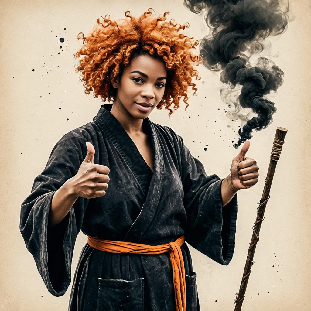 Old book style ink illustration, on parchment, ink splashes, ink stains, ink smears, faded ink, 1person, solo, (thumbs up), ((robes)), close-up, surprised, blushing, ((smoke)), blowing smoke, looking around, navel, orange hair, afro, dirty face, short hair, permanent, curly hair, green eyes, witch hat, simple clothes, boots, holding staff, forest, dungeon