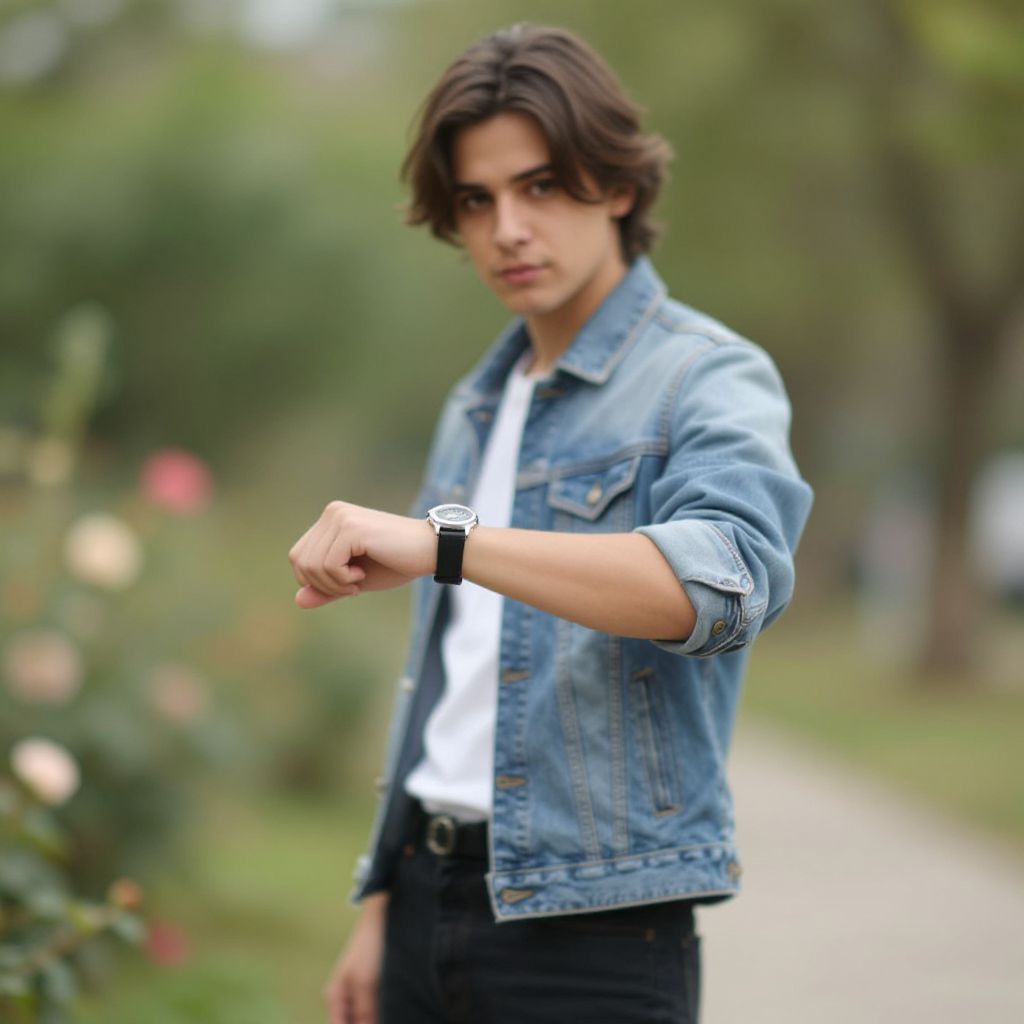 Photograph of a young man with medium-length, wavy brown hair, standing outdoors on a blurred, green park path. He wears a light blue denim jacket over a white shirt and black pants. His right arm is extended forward, pointing with his index finger, and he wears a black wristwatch on his left wrist. The background is softly focused, featuring green trees and a few colorful flowers on the left. The man's expression is serious, and his gaze is directed towards the point he is indicating. The overall lighting is natural, suggesting daytime.