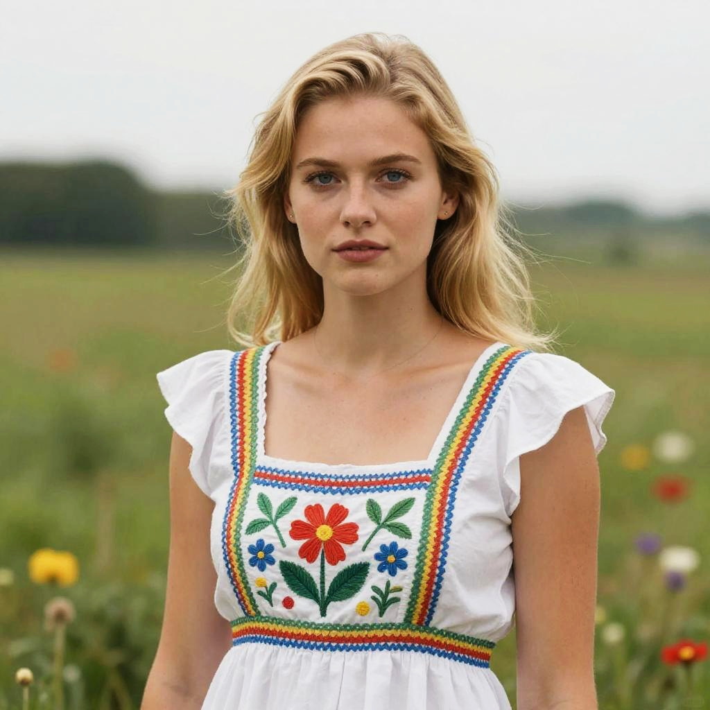 Realistic photo.Portrait by Phil Koch of a cute 25-year-old woman with blonde hair, blue eyes, wearing a simple farm dress, painted with vibrant colors and realistic details realistic photo