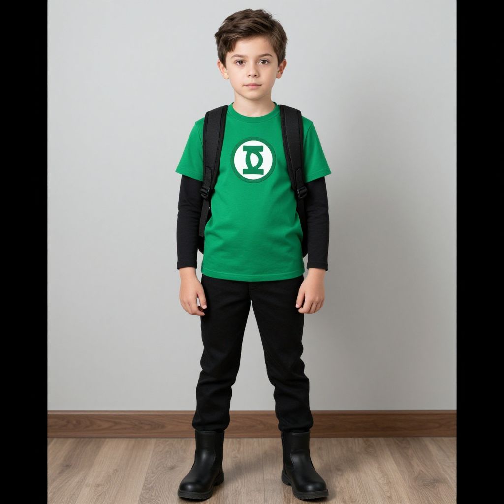 Photograph of a young boy with short brown hair, wearing a green shirt with a white symbol, black pants, and boots, standing against a plain