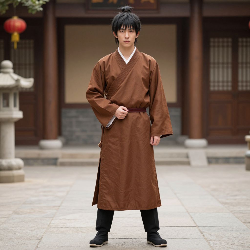 Sokka Adult Costume, man in a brown robe standing in a courtyard