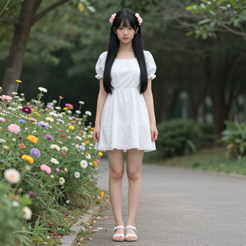 Photograph of an Asian woman with long black hair, wearing a white, short-sleeved, floral-embellished dress and pink flower headband. She stands on a paved path in a garden, surrounded by vibrant, multi-colored flowers. She wears white sandals, and her expression is neutral. The background features lush green trees and more flowers, creating a serene, natural setting. The image has a soft focus, with the woman sharply in the center, and the background slightly blurred. The overall mood is peaceful and charming.
