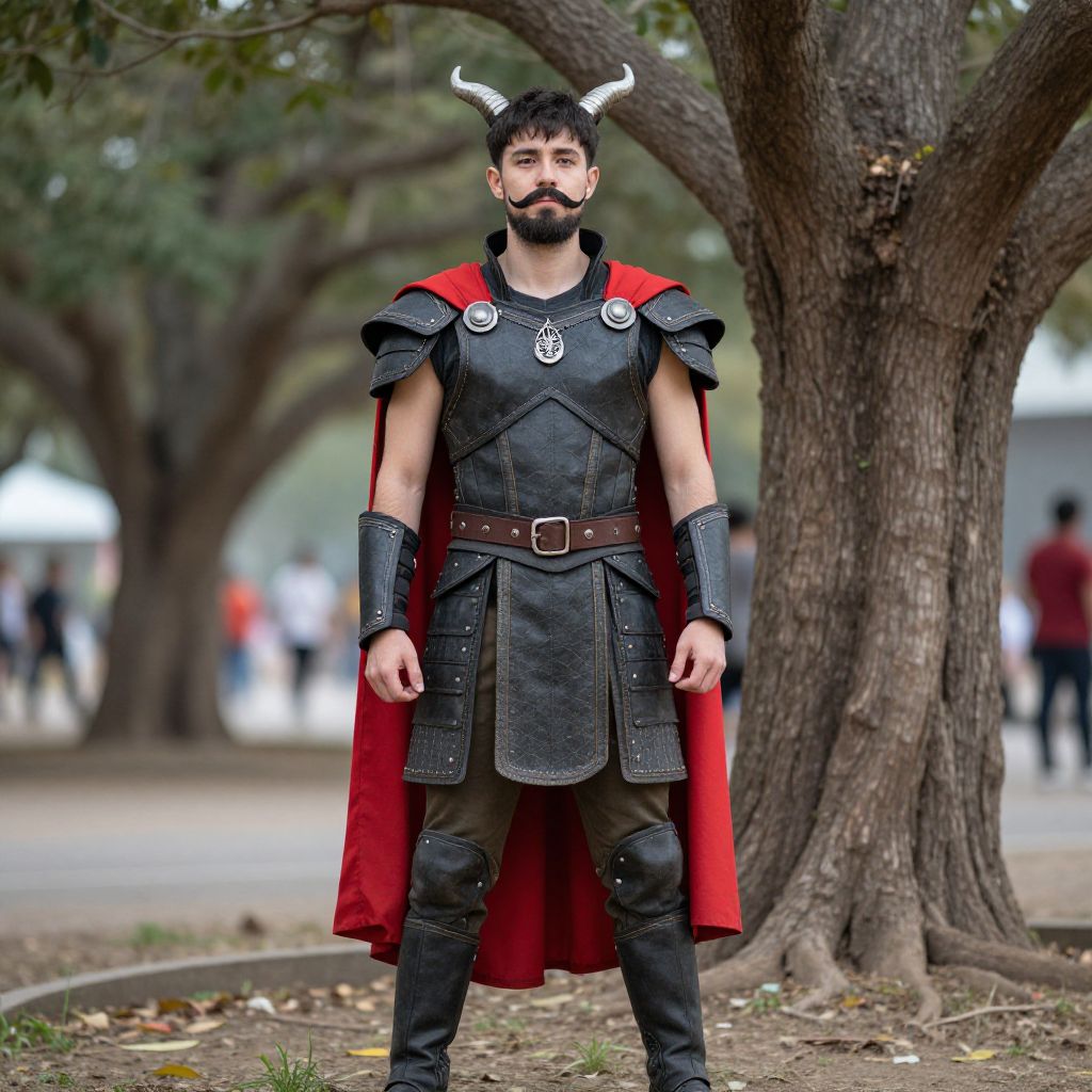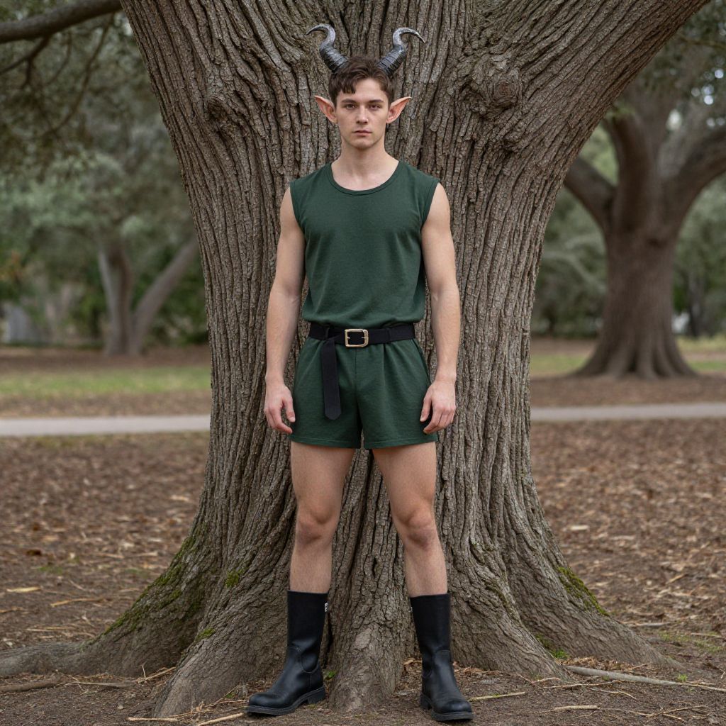 Photograph of a young man with elf-like horns, wearing a dark green tank top, shorts, black boots, standing against a large tree in a