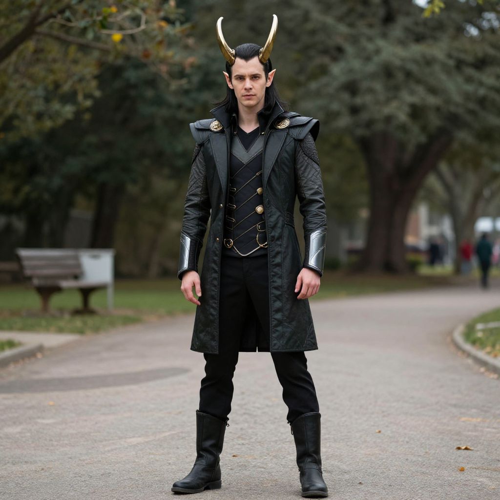 "evil elf costume, solo, 1boy, male focus, pointy ears, horns, boots, standing, tree, full body Realistic photo of casual sexy person with pretty face"