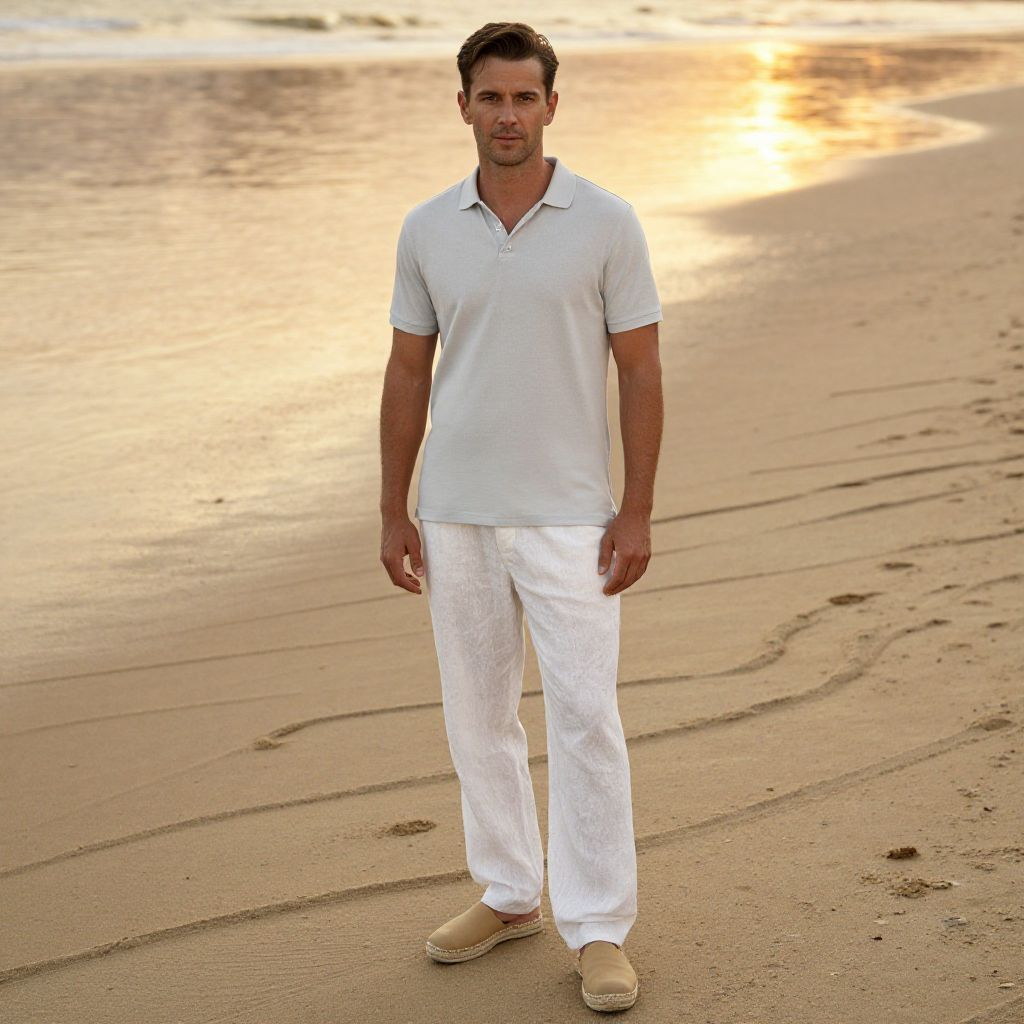 Photograph of a handsome man with short dark hair, wearing a white polo shirt, white pants, and beige loafers, standing on a golden sandy