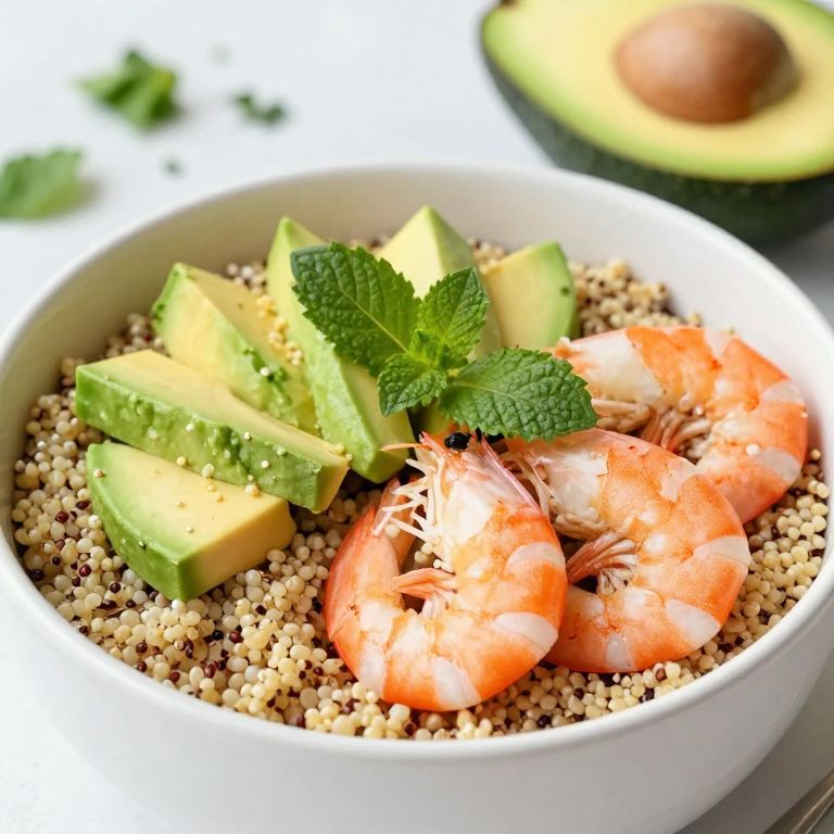 Close-up front view of a white bowl filled with golden quinoa, vibrant orange shrimp, fresh green avocado cubes, and garnished with a sprig of mint, accompanied by a halved avocado and scattered herbs in the background.