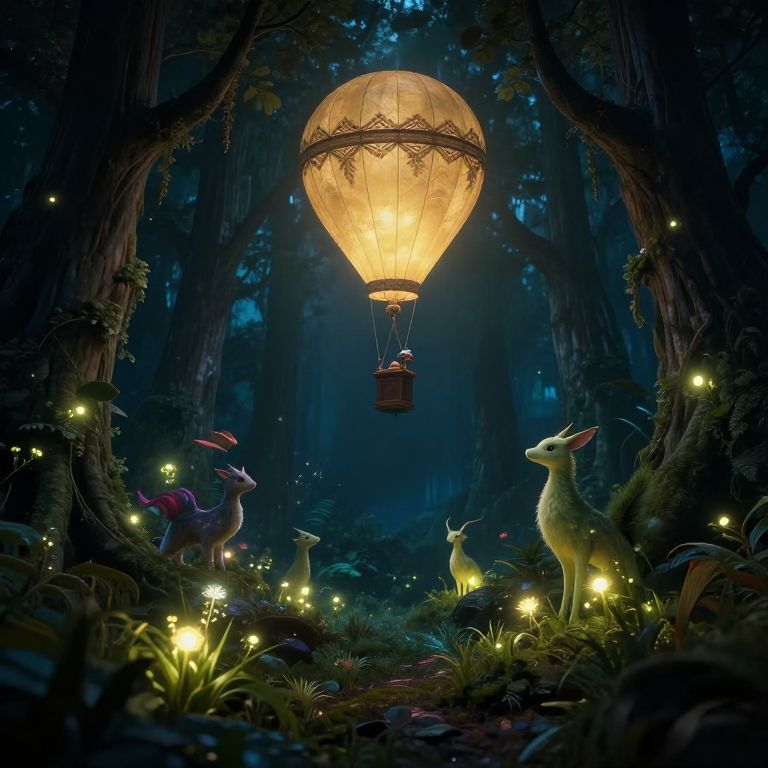 A whimsical scene featuring a balon drifting over a magical forest filled with glowing plants and mythical creatures, soft bioluminescent lights illuminating the scene, mystical and enchanting mood with deep contrasts and rich details.