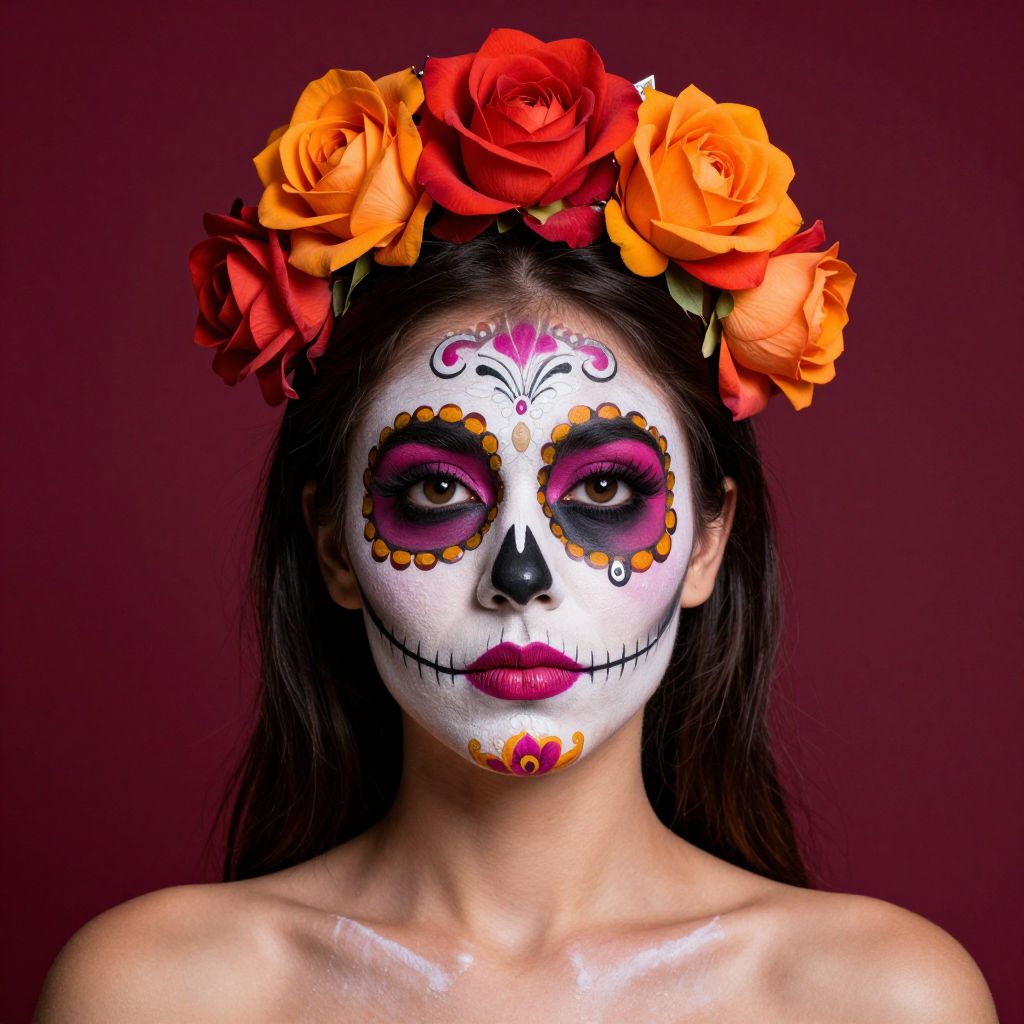 Woman wearing vibrant Day of the Dead makeup featuring intricate designs, bold colors, and a floral crown of orange and red roses against a maroon background.