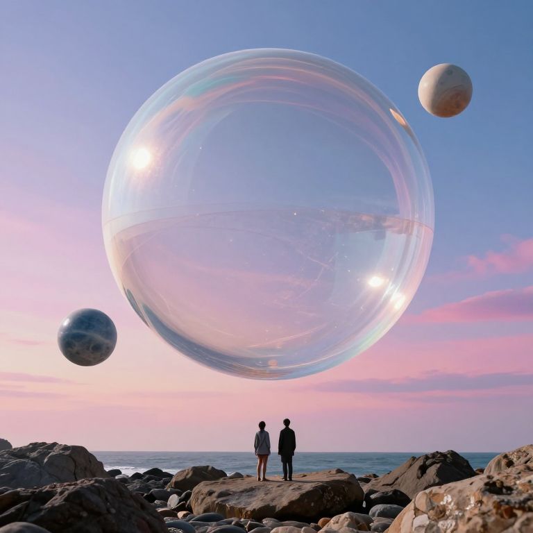 Surreal architecture emerges within a colossal, translucent bubble suspended above a rocky shoreline, where two figures stand below, gazing upward as smaller celestial spheres float nearby against a vibrant sky.