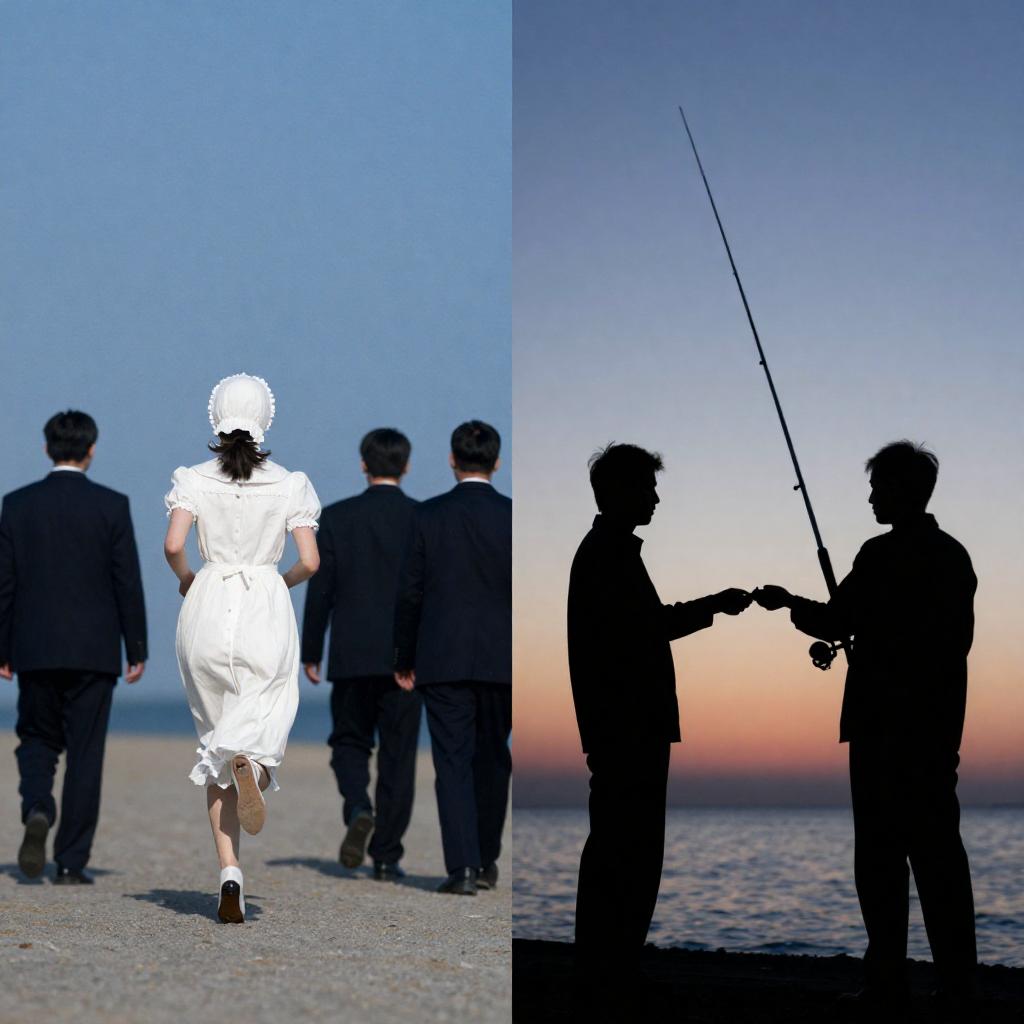 Composite image featuring two distinct scenes: on the left, a woman dressed in a vintage white dress and bonnet running away from four men in dark suits on a sandy surface; on the right, two men in silhouette fishing at sunset by the ocean, with one man handing an object to the other against a colorful sky.